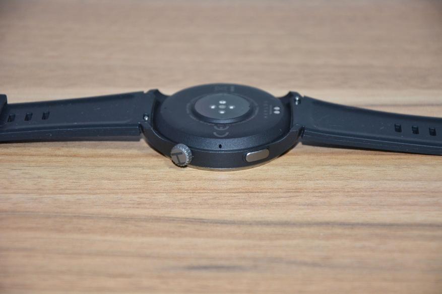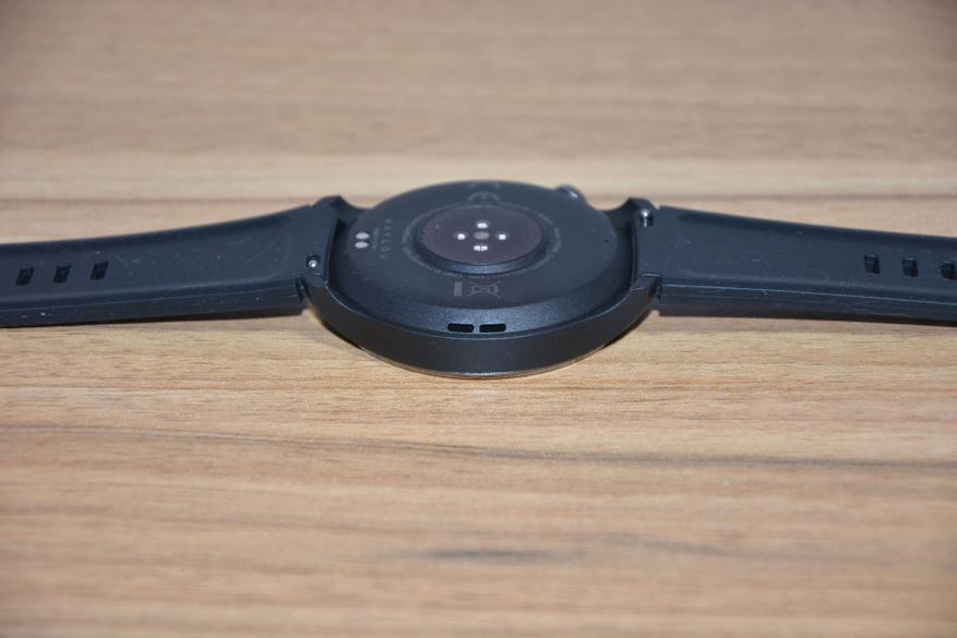 На нижней стороне контакты для зарядки и датчики в центре. Внизу слева прорези динамика, справа отверстие микрофона. Ни к тому, ни к другому особых нареканий нет. Динамик чуть хрипит на максимальной громкости, микрофон чуть глуховат — цена и класс потребительской электроники все оправдывают. Существенный плюс — ни сами часы, ни микрофон с динамиком не боятся воды, можно принимать душ, можно плавать.