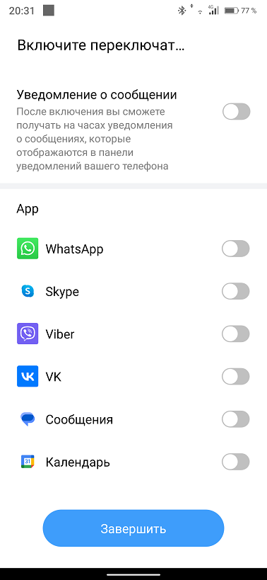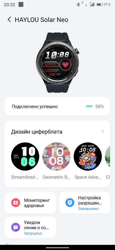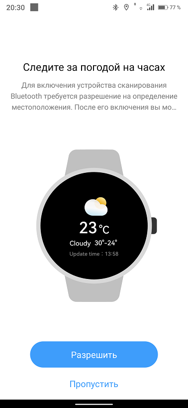 Из списка выбираем модель Solar Neo и привязываем часы к приложению, которое тут же предложит определиться с виджетом погоды, разрешениями для приложений с сообщениями.