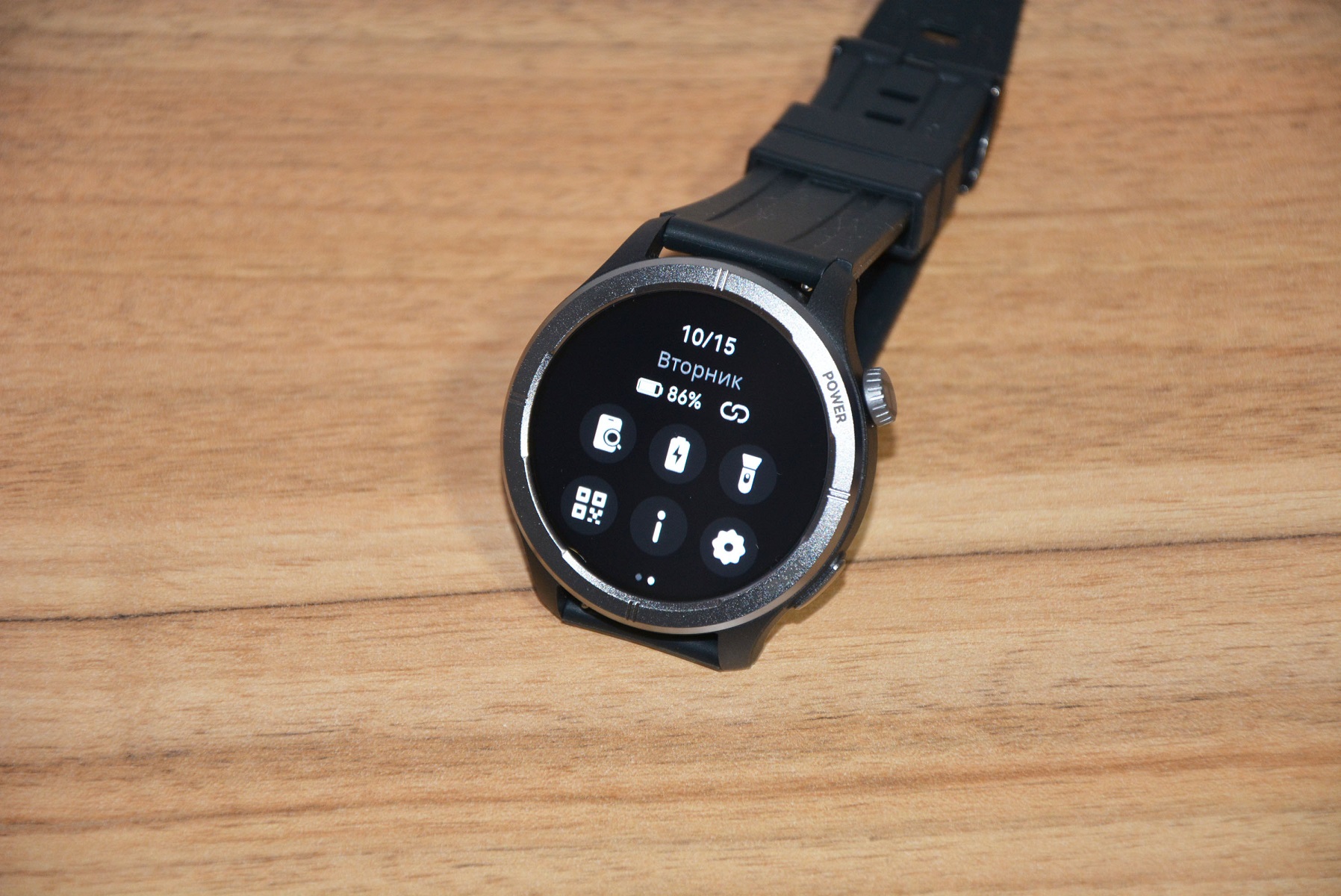 На втором слайде поиск телефона (иногда очень полезная функция), энергосберегающий режим (экран становится не таким ярким), фонарик, когда весь экран засвечивается белым (в темном подъезде вполне), иконка QR приложения, информации о часах и меню настроек.