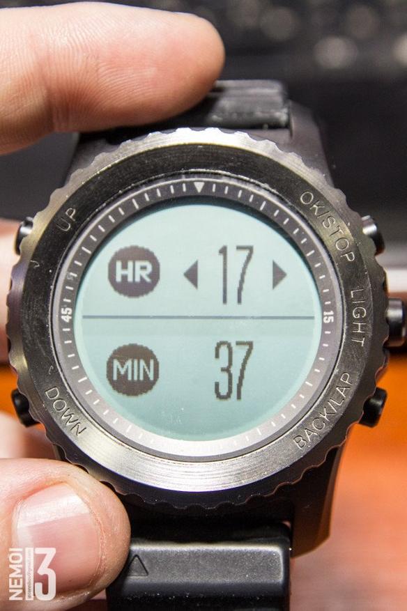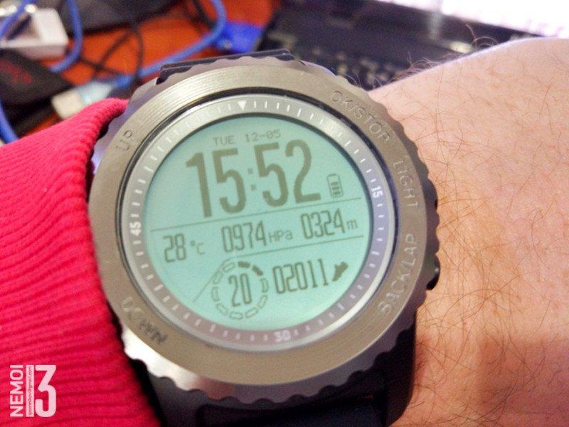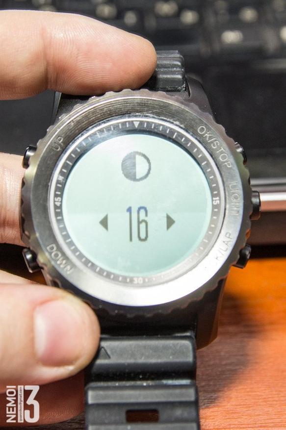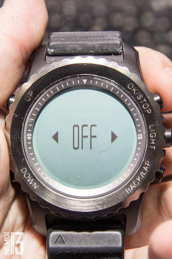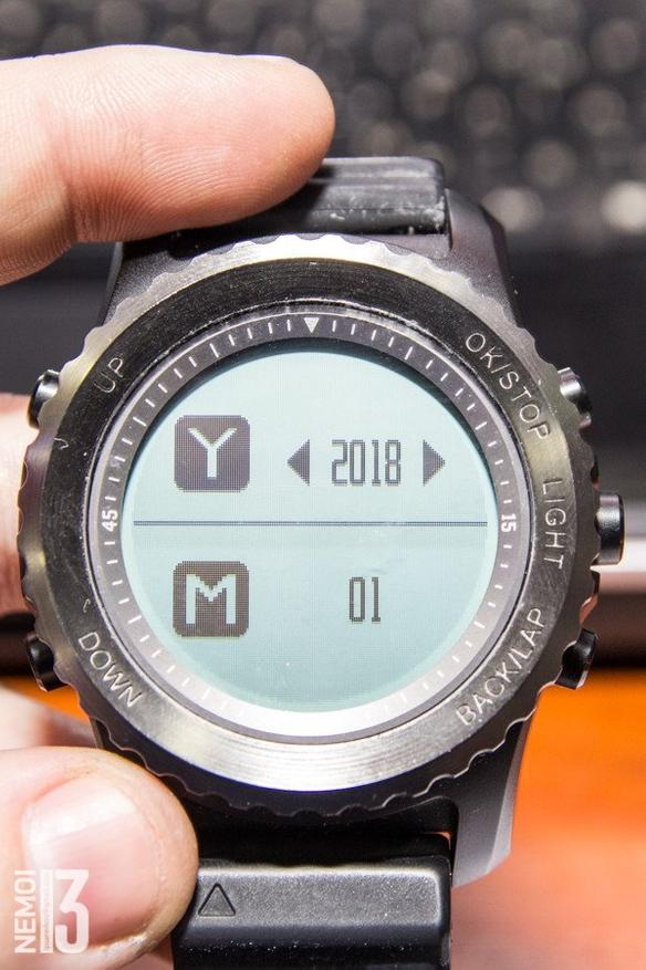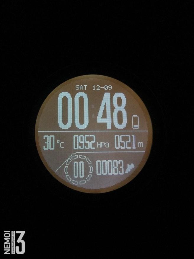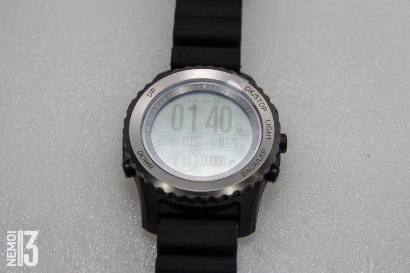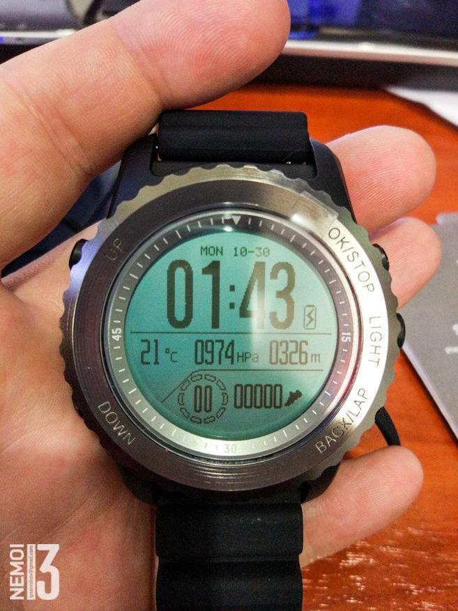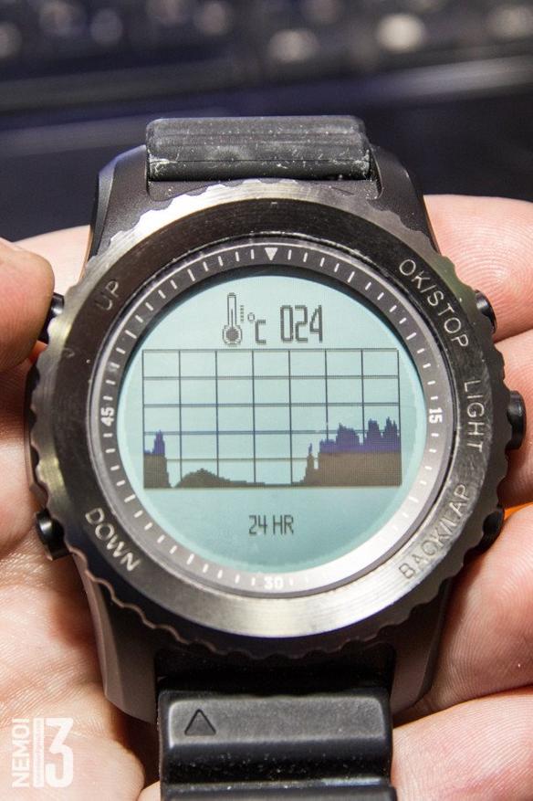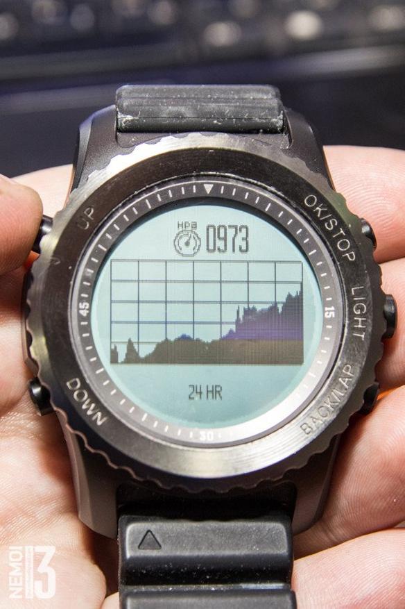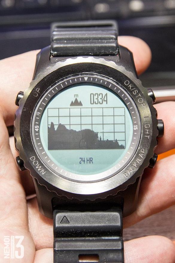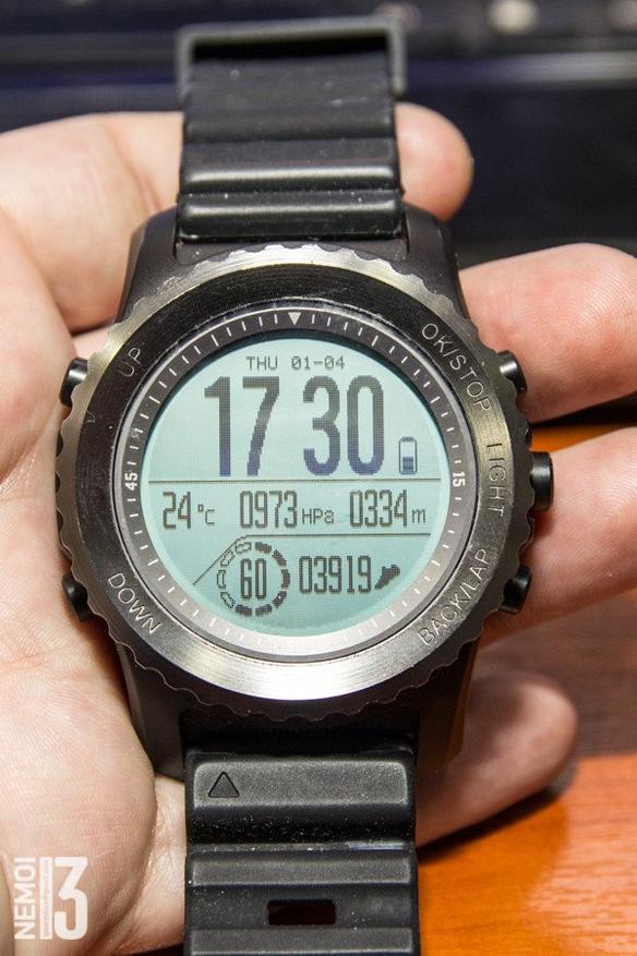 Самые большие цифры — это текущее время. Сверху дата. Небольшой значок уровня заряда. Ниже указана текущая температура часов, уровень атмосферного давления в паскалях (на привычные нам мм. ртутного столба не переключить) и высота над уровнем моря.