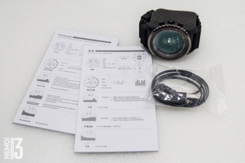Комплектация состоит из двух инструкций, на английском и китайском языках, часов и магнитного кабеля для зарядки: