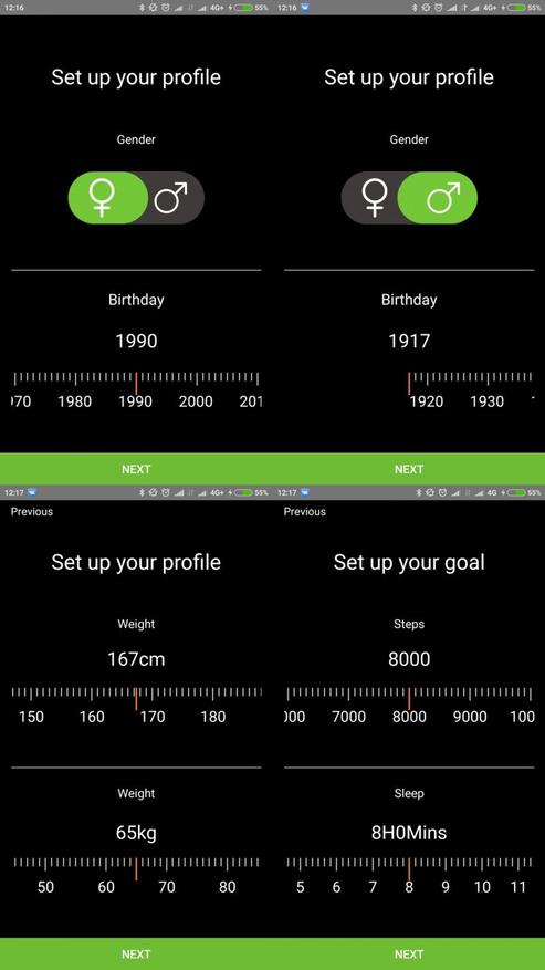 При первом запуске устанавливаем свои параметры. Рост, вес, пол. Желаемое количество активности в день: