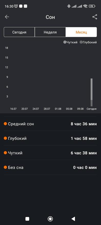Следующий свайп открывает доступ к меню отслеживания параметров сна. Помимо общей продолжительности, можно увидеть длительность фаз и статистику за неделю.