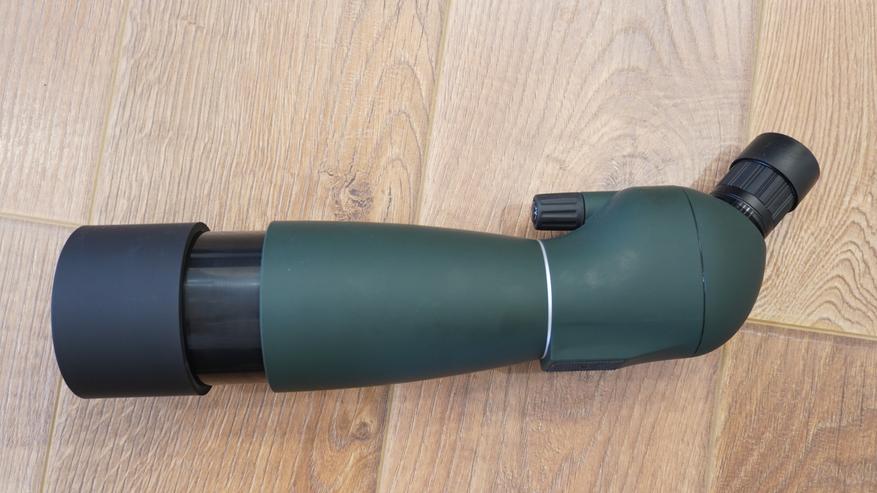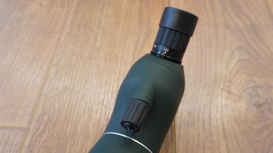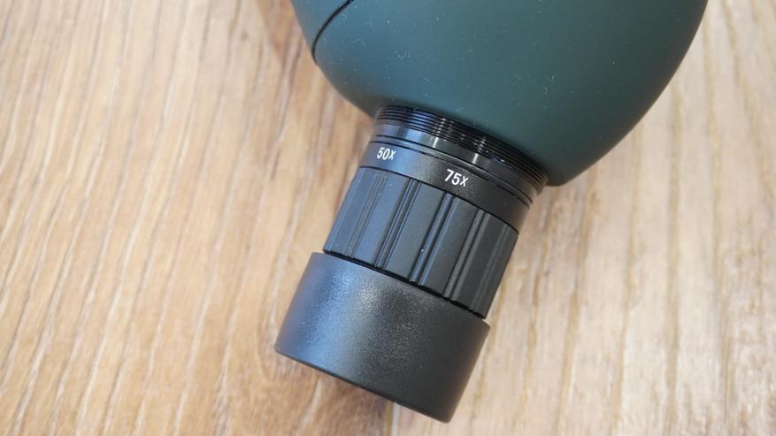 Не смотря на крупные габариты, труба отлично размещается в руке, имеет эргономичную форму и не скользит. Удобнее, естественно, удерживать ее двумя руками: одной наводить фокус, второй направлять в нужную сторону. Диаметр видоискателя — 21 мм, он дает увеличение от 25 до 75 раз, а с противоположной стороны можно видеть линзу 70 мм, которая прячется под пластиковую крышку. Объектив покрыт специальной FMC пленкой, которая улучшает прохождение света, повышает контраст и яркость изображения, его четкость, обеспечивает легкое наблюдение в условиях низкой освещенности. Окуляр съемный, от попадания пыли и брызг при транспортировке защищен резиновой крышечкой. Особое внимание заслуживает резиновая накладка на окуляре. Эта деталь, хоть и кажется мелочью, играет важную роль в обеспечении комфорта пользователей даже с плохим зрением. Особенно актуально для тех, кто носит очки.