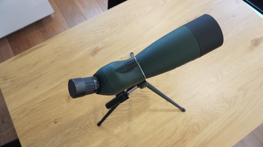 А в комплекте также имеется настольный штатив, в классическом исполнении: это металлическая конструкция на 3-ех ногах с возможностью регулировки положения зрительной трубы, организовано, благодаря выносной рукоятке. Выглядит штатив миниатюрно и добротно. Несмотря на свой небольшой размер и довольно значительный вес прибора, штатив довольно устойчивый. Каждая ножка раскладывается туго, каждая оборудована резиновыми накладками. На корпусе монокуляра имеется площадка с резиновой накладкой и резьбовой втулкой под 1/4″ под штатив. Если штатив, которым упаковал производитель комплект, не подходит, вы без проблем можете заменить его на другой, крепление стандартное.