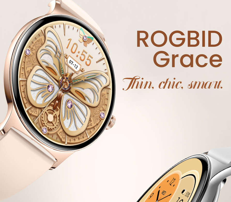 Rogbid Grace — новая модель, ориентированная на женскую аудиторию, отличается стильным дизайном и лёгким весом. Часы получили 1,43-дюймовый экран по технологии AMOLED с разрешением 460 x 460 пикселей и металлическим корпусом, соответствующим технологии IP68. Устройство представлено в трёх цветах: золотом, серебристом и чёрном. Вес часов составляет 28 гр., а толщина устройства — 7,8 миллиметров. Батарея ёмкостью 250 мАч позволяет устройству работать до 7 дней без подзарядки.