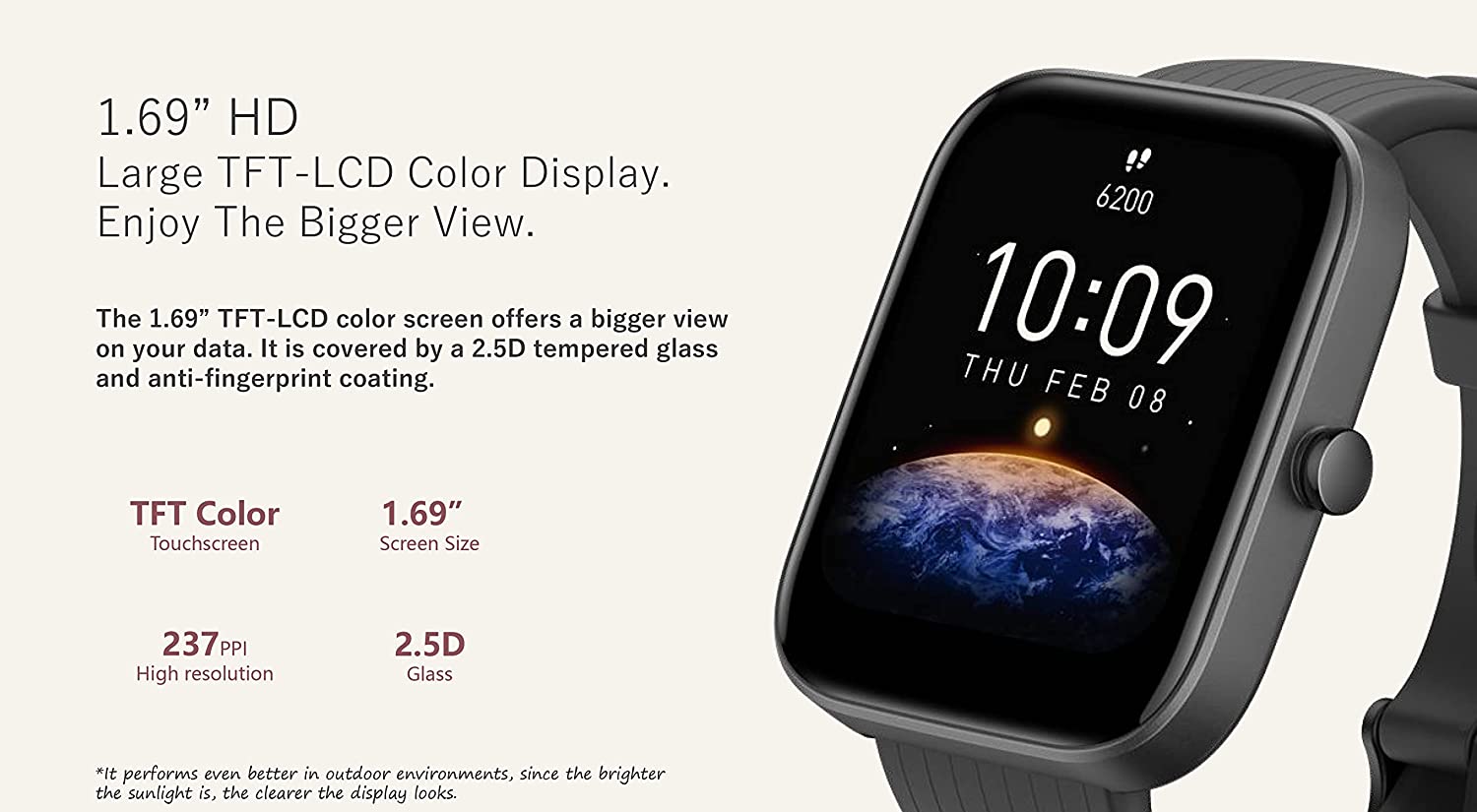Форм фактор часов позволяет выводить на экран большое количество полезной информации, тем более если этот экран имеет диагональ 1,69". У предыдущих Amazfit Bip U диагональ составляла 1,43", так что прирост будет довольно ощутим. При этом часы нельзя назвать громоздкими, их габариты увеличились незначительно и составляют 44,2 мм х 36,6 мм х 7,6 мм. Дисплей изготовлен по технологии TFT-LCD и имеет детализацию 237 PPI, а его поверхность защищена закаленным 2,5D стеклом.