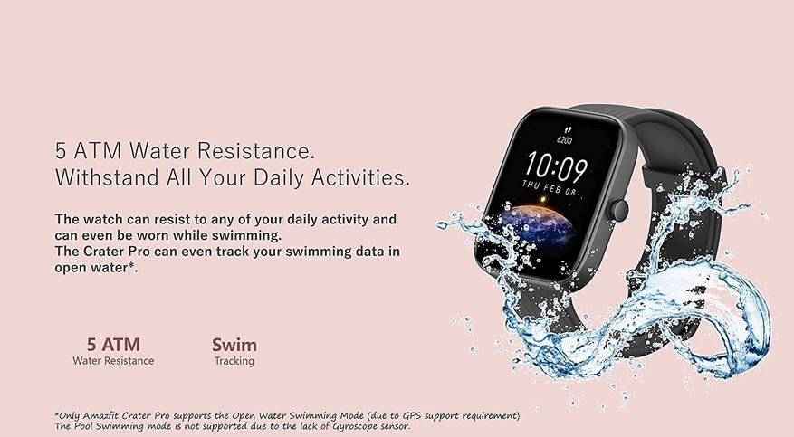 Часы имеют защиту от воды 5 АТМ, а значит вы можете не снимать их в душе или бассейне. Кроме этого есть поддержка спортивного режима «плавание», а значит вы можете их использовать для тренировок в бассейне или на открытой воде.
