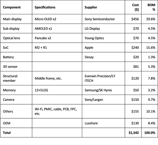 По данным исследования Omdia, общая стоимость материалов для гарнитуры смешанной реальности Vision Pro составляет 1542 доллара. Самыми дорогими компонентами являются два дисплея Micro OLED, поставляемые Sony Semiconductor, которые стоят 456 долларов и составляют 29,6% от спецификации.