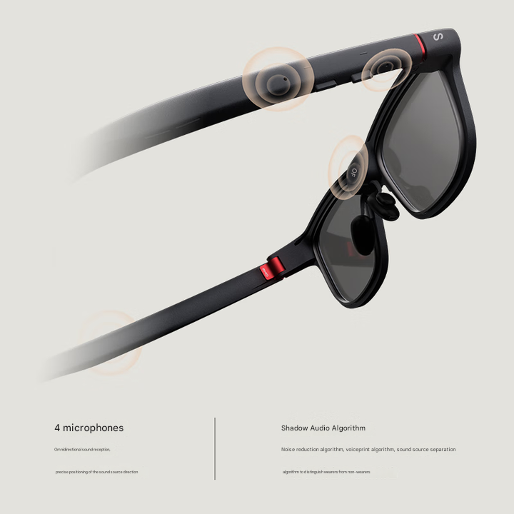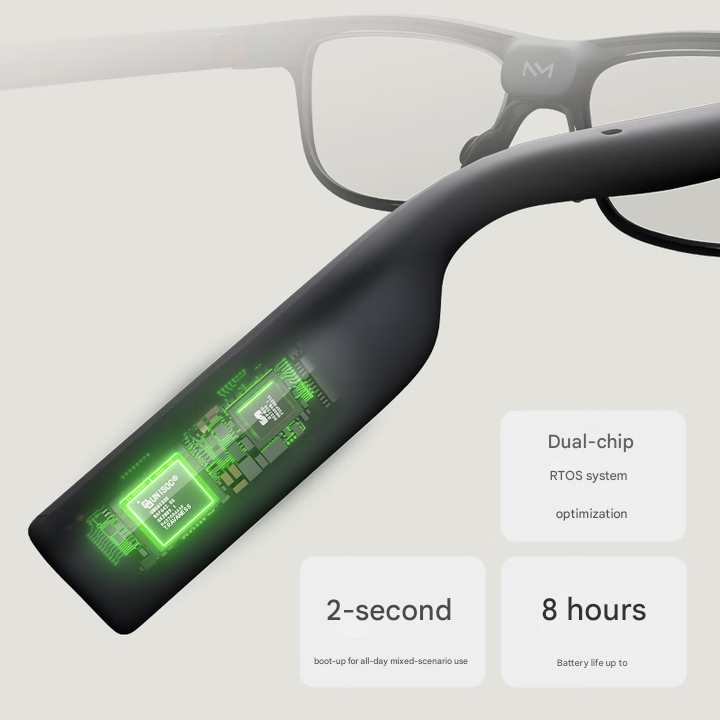 Модель весит 53 грамма и выполнена с использованием пяткоординатной CNC-обработки. Толщина дужек составляет 8 мм, что, по заявлению производителя, является рекордно малой для умных очков в Китае. В каждую линзу встроены монохромные MicroLED-панели разрешением 640 x 480 с яркостью 1500 нит, обеспечивающие приватный дисплей без отвлечения от реального окружения.