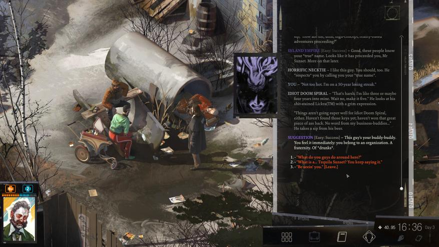 Сейчас Disco Elysium прохожу на телефоне. Блин, как оказывается просто можно испортить хорошую игру со сменой жанра. Оригинал — классическое RPG, а мобильная версия — визуальная новелла. Но дело не в том, что теперь мы не ходим по локациям, а перематываем картинки. Это терпимо. В отрыве от оригинала — это даже могла быть великолепная визуалка. Но буквально одно гейм-дизайнерское решение игру прям испоганило.