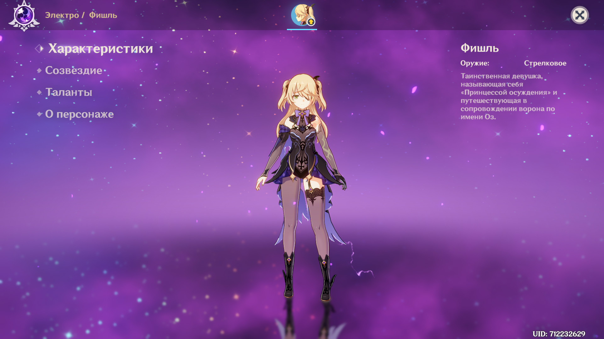 Фишль — таинственная молодая девушка, предпочитающая использовать лук для нанесения урона. Впервые встречается игроком в цепочке начальных заданий в Мондштадте. Обладает умениями призыва фамильяра в виде чёрного, как смола ворона, способного наносить урон по площади молниями и использовать ранее наложенные на команду усиления. Не требовательна к ресурсам для прокачки. Идеальный герой для первой половины игры.