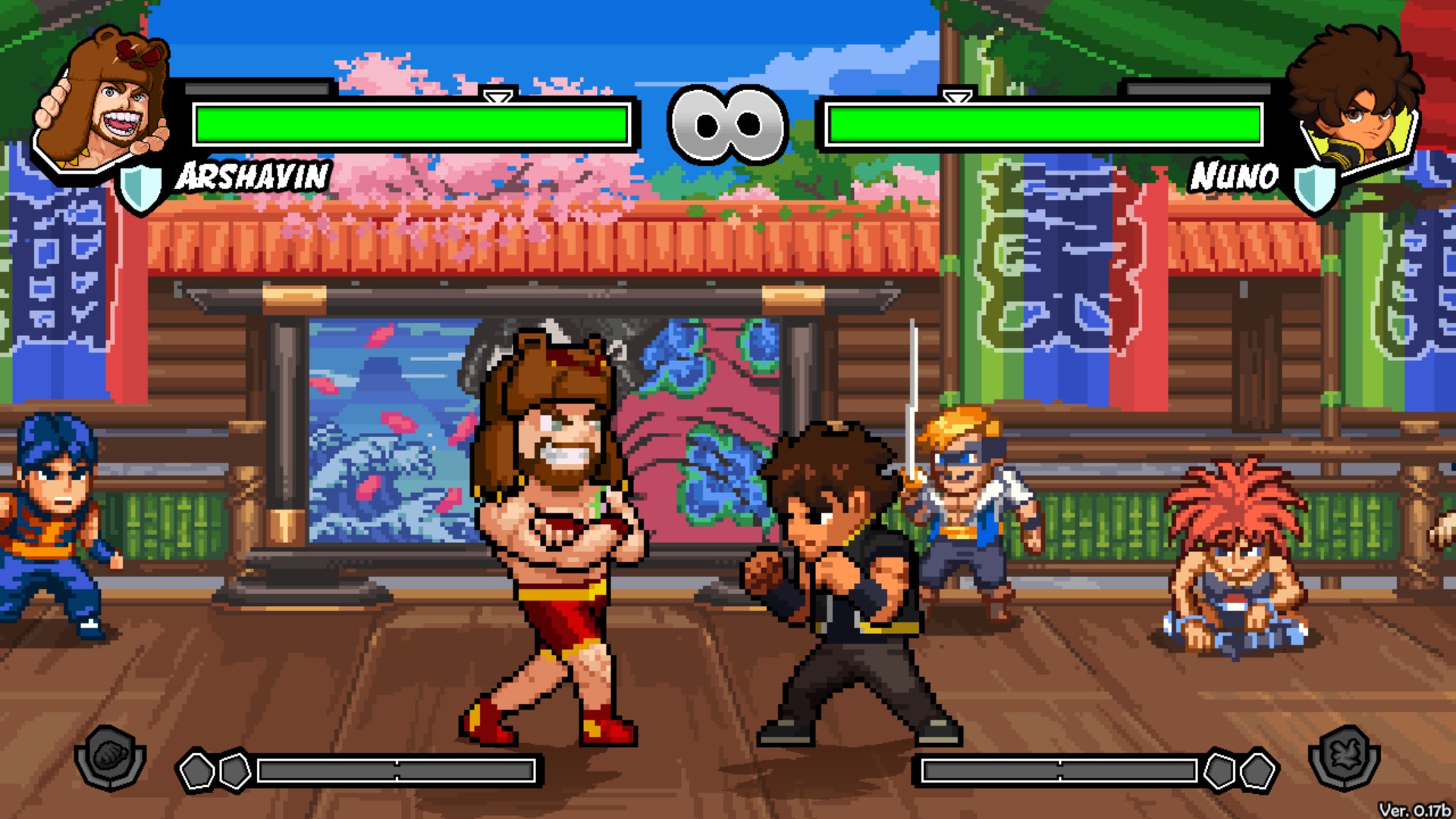 Скромная графика мобильной игры, но стильный арт, продуманные анимации, красивые задники, особый подход за разных персонажей. Мне очень нравится AI ботов. Такое впечатление, что они постепенно изучают уровень скилла своего противника (нубяра с клавиатурой, не понимающий в комбухи) и начинают подстраивать тактику под мой стиль боя. Как и положено хорошему файтингу, игра проработана вплоть до меню и наполнена очень творческим артом. В демо доступны четыре персонажа с различным подходом к ведению боя. Среди них есть шикарный аналог Зангиева — Александр Аршавин. Пафосно перемещается по арене, пафосно падает и поднимается, пафосно показывает большие пальцы при пропущенном ударе, пафосно станится, пафосно бросает! Рекомендую всем поклонникам пиксельных ретро-файтингов.