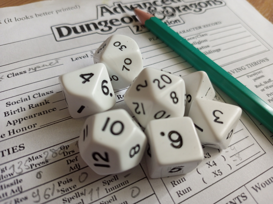 Речь пойдет о том, как играется в Advanced Dungeons & Dragons 2nd edition - набор правил, открывший для меня и моих друзей прекрасный мир настольных ролевых игр. Здесь хотелось бы поделится личным опытом и особенностями настольных ролевок. Чтобы начать играть не нужна мощная видеокарта или актуальные консоли, все что нужно иметь: набор игральных костей (Dice), лист в клетку, карандаш и ластик. Все необходимые книги правил можно найти в сети или приобрести официальные издания. Желательно, конечно, найти опытного ведущего, но можно попробовать вести игру с нуля. Здесь вы сами себе гейм-дизайнер и художник.