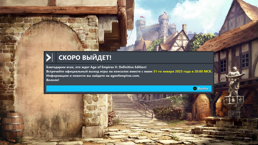 Age of Empires II: Definitive Edition свободно скачивается из российского региона. Проблем при установке не возникло. Запустив игру раньше срока, можно увидеть послание от разработчиков.