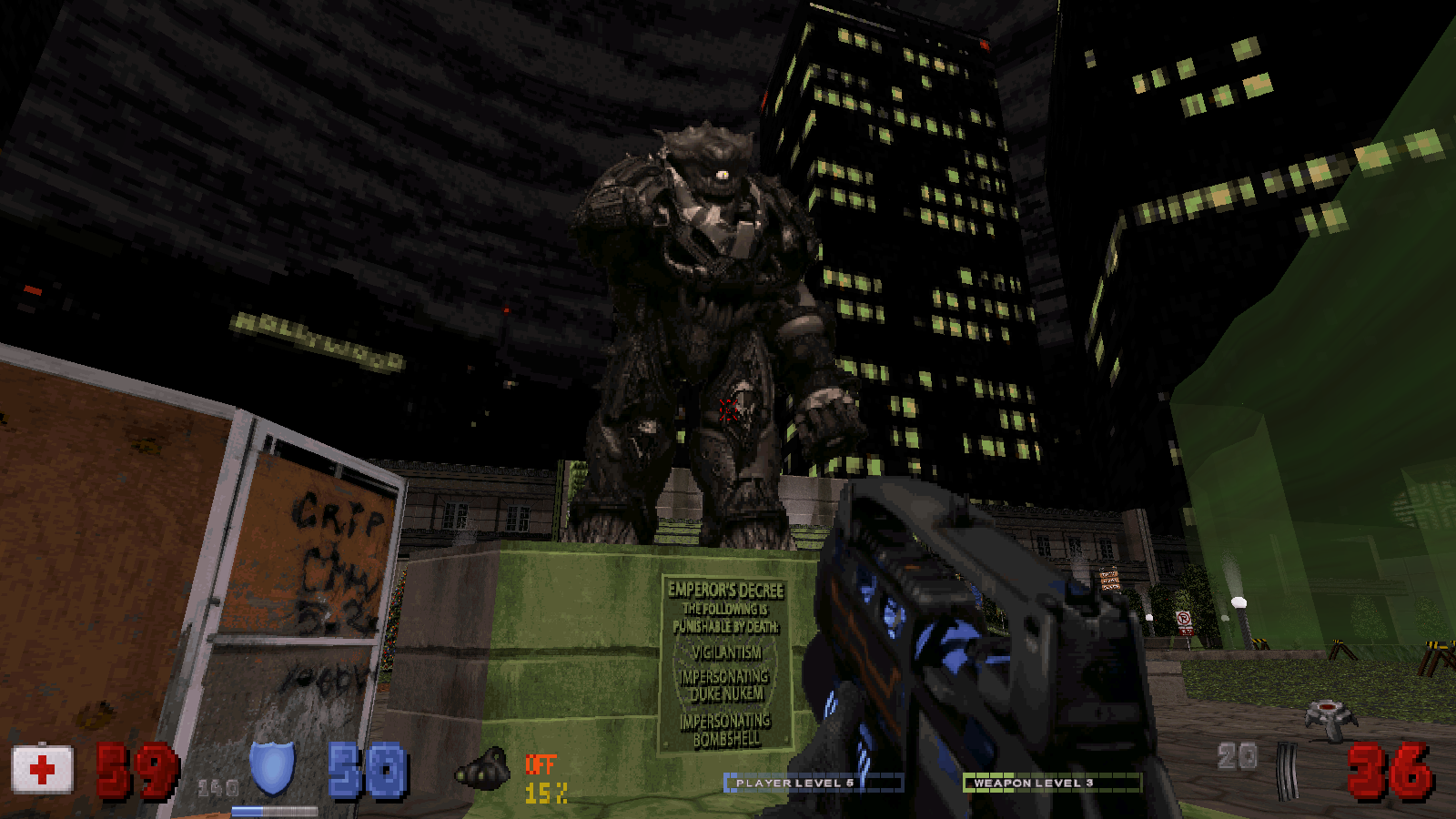 Для меня в игре есть только один существенный минус — это возможность запуска только на операционной системе типа Windows. EDuke32 — не самая лучшая кросс платформа. Однако некоторым может не понравится новые механики, как-то набор очков опыта или покупка улучшений с помощью выпадающих из врагов монеток. Не по классике это, не по-олдовому. Да и динамика происходящего дает фору множеству классических шутеров. Людям рожденным уже после 2000-х может не понравится старая, пусть и обновленная, спрайтовая графика. Тут даже воксели не везде используются.