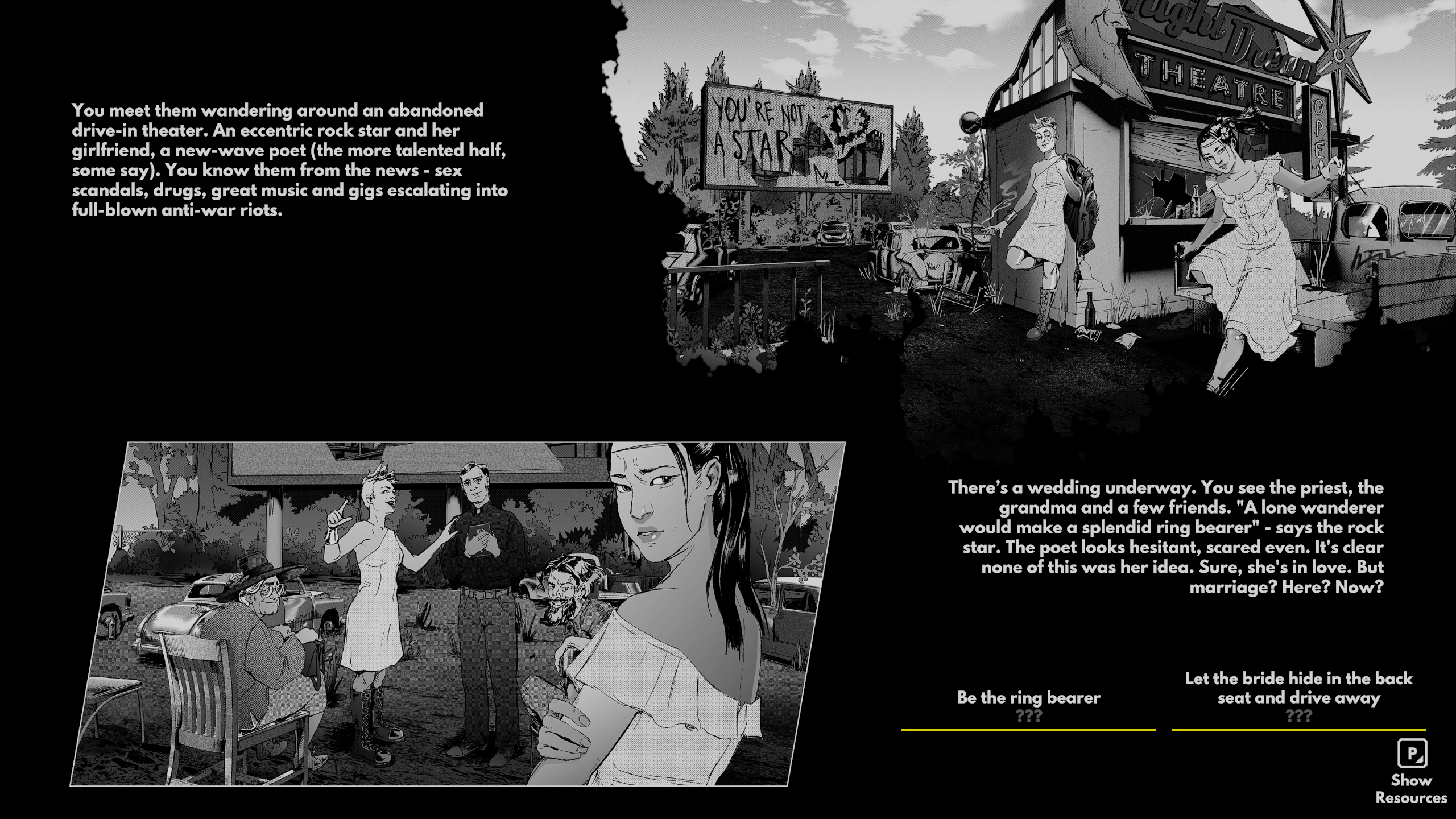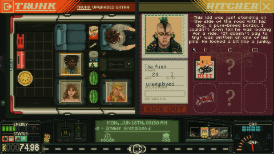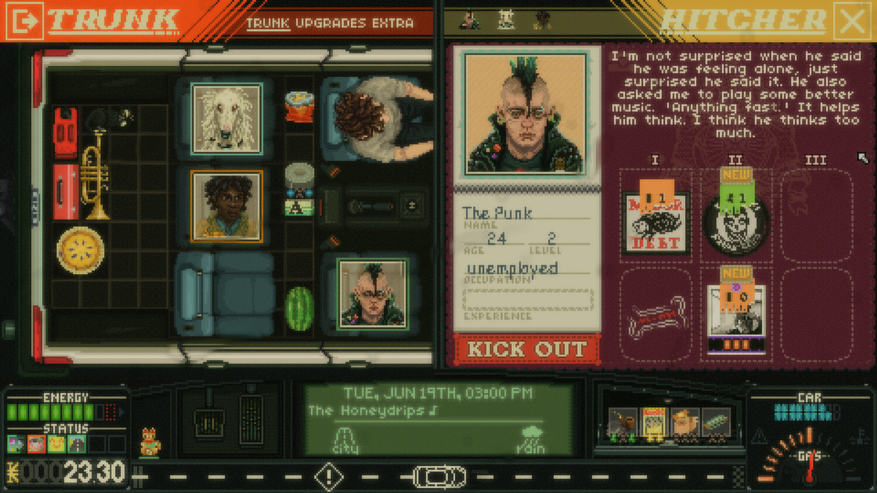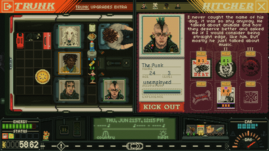 Любопытно, что в игре есть персонаж-панк, который сделан он на славу. Он сделан настолько хорошо, что почти осязаем. Тоже всего несколько строк текста и картинка, но он ощущается живым. Во-первых, у него есть собака, потому что панки дружат с животными, а некоторые особенно радикальные даже освобождают их из клеток. Во-вторых, он — веган и стрэйтэджер, то есть не ест мясо, животные продукты, не пьёт алкоголь. Он любит быструю музыку, слишком много думает и не стесняется говорить напрямую то, о чём думает. В Heading Out таких нет, игра вообще пустая по части персонажей. Есть какая-то Электрическая Девушка, Дама с Цветами, про них говорят по радио, но когда я с ними встретился, не сразу понял, кто это, настолько персонажи проходные.