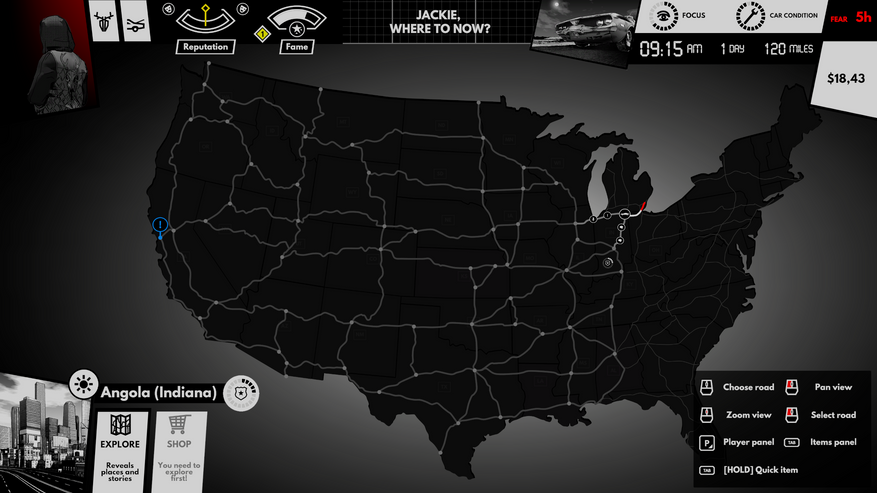 После первого успеха игроку открыты все дороги. Можно выбрать любой путь, но выбирать стоит с умом, потому что в дороге могут встретиться самые разные приключения и опасности. Например, можно поучаствовать в гонке с соперниками или без, можно пройти короткую историю с текстовым квестом, случайная радио-трансляция. Главное — не останавливаться надолго, т.к. остановка отнимает драгоценное время, за которое игрока может нагнать дьявол или страх. Это такая невидимая сила, представленная красной полосой, неумолимо ползущей по пятам. В некоторых городах можно приобрести игровые предметы, которые смогут ненадолго остановить страх. Задержать наступающий страх помогут награды за некоторые гонки. Например, уход от полиции позволит выбрать задержку страха, аналогичную награду можно получить за спокойную гонку.