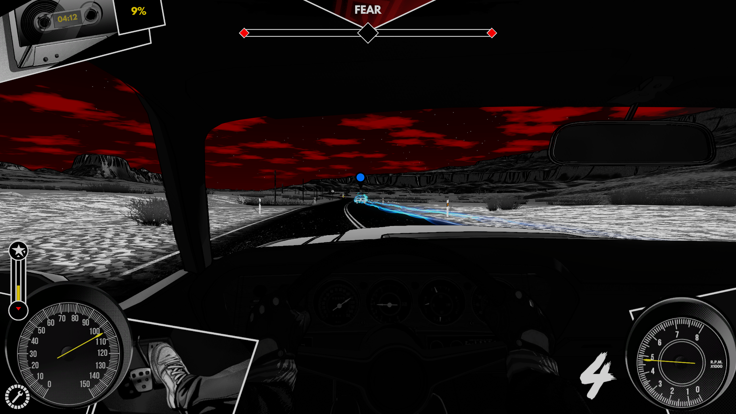 Кроме страха в игре есть ещё два важных ресурса — усталость и состояние автомобиля. Усталость, она же фокус или концентрация — мера, как далеко Джеки может уехать. Каждая поездка отнимет немного энергии, приближая гонщика к усталости. При полном упадке сил картинка на экране будет периодически размываться, что должно усложнять игру, имитировать усталость, но получается не слишком убедительно.
