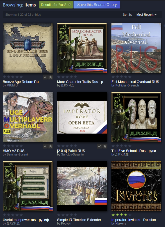 Как и все игры Параходов, в Императоре поддержка модов — это не роскошь, а средство продвижения. Но особенно это заметно на ИР, именно потому что официально поддержка его прекратилась аж три года назад, с тех пор хоть какие-то изменения (не считая неожиданного подарка в виде патча 2.0.4) можно ожидать только от сообщества фанатов, которые и карты делают, и тотальные конверсии делают, и просто наполняют ванильную версию бОльшим количеством контента, как самый известный и популярный Imperator: Invictus. Переводчики не отстают, и локализируют на русский самые качественные и востребованные моды, чтобы сообществу было удобно.