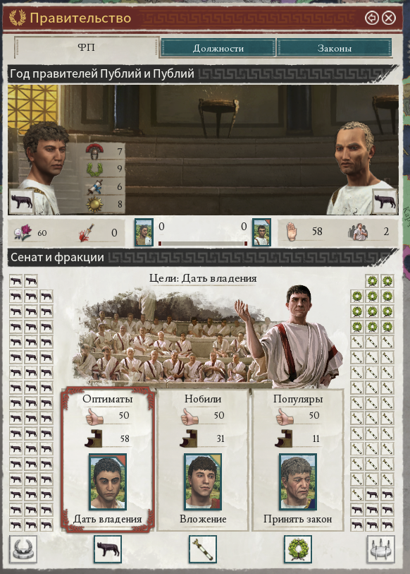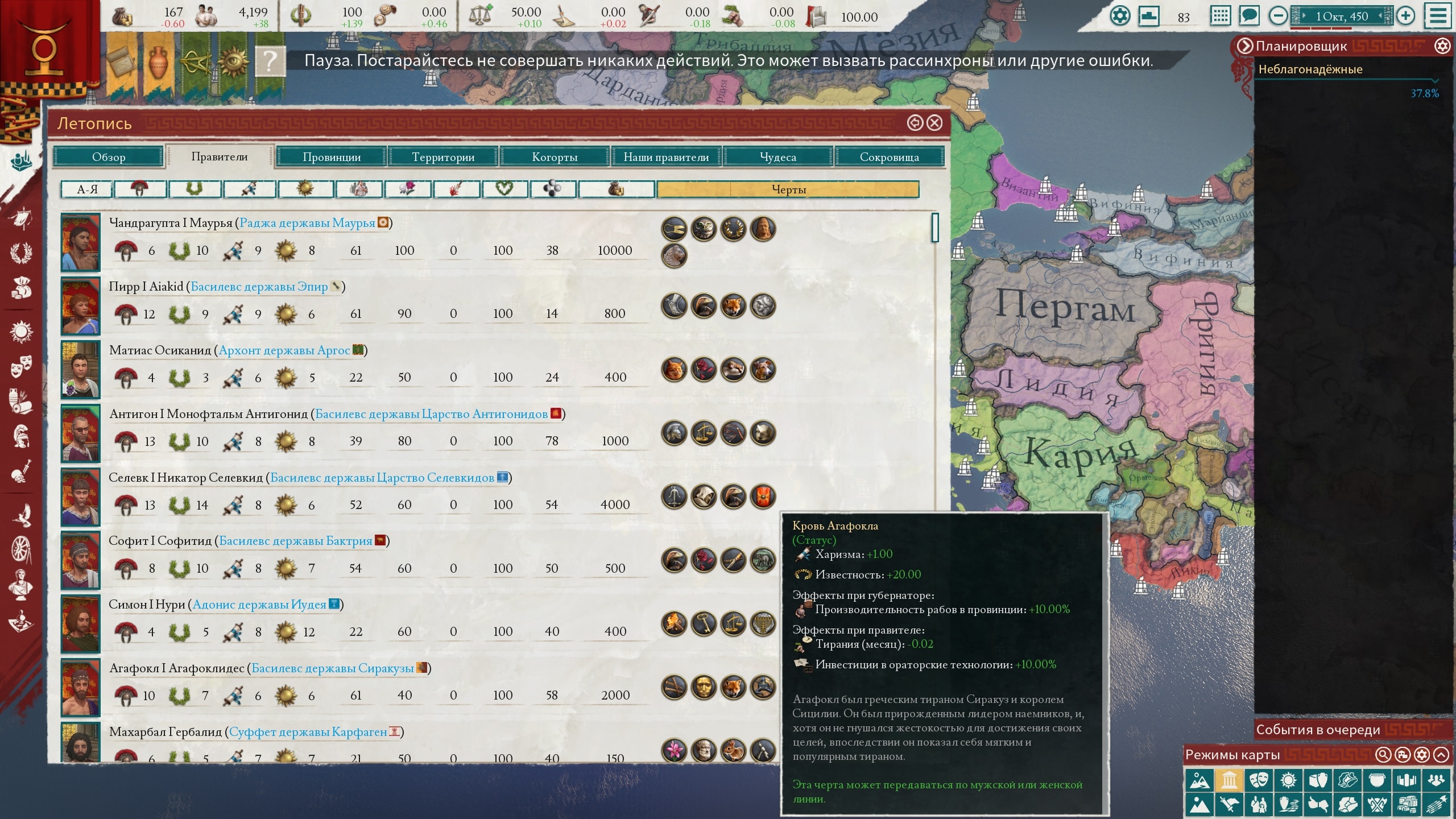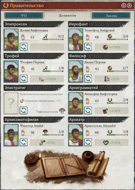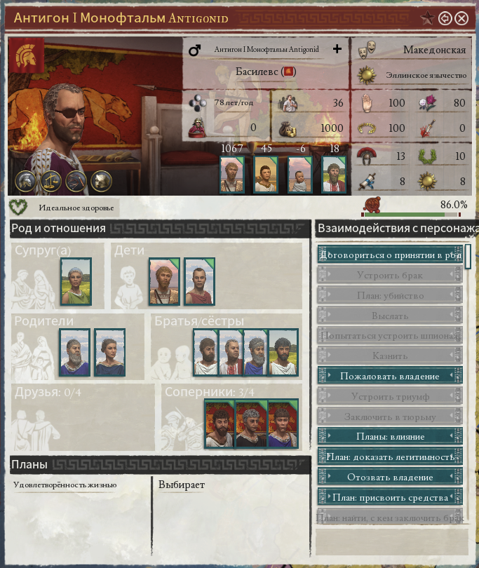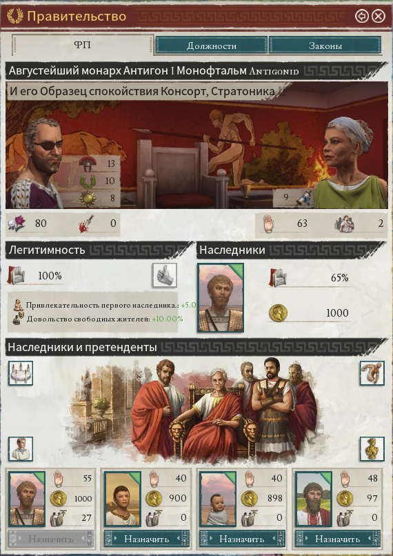 И нет, это не только у правителей. Все сколько-нибудь значимые персонажи всех стран симулируются игрой. Даже командиры армий наёмников и пиратов, пусть и с гораздо меньше степенью детализации. Большинство игроков могут проиграть основной сценарий от начала и до конца не заморачивая на династические браки, воспитание детей и гладиаторские бои, лишь изредка назначая чиновников на освободившееся место. Да это будет не особо эффективно, но тем не менее возможно.