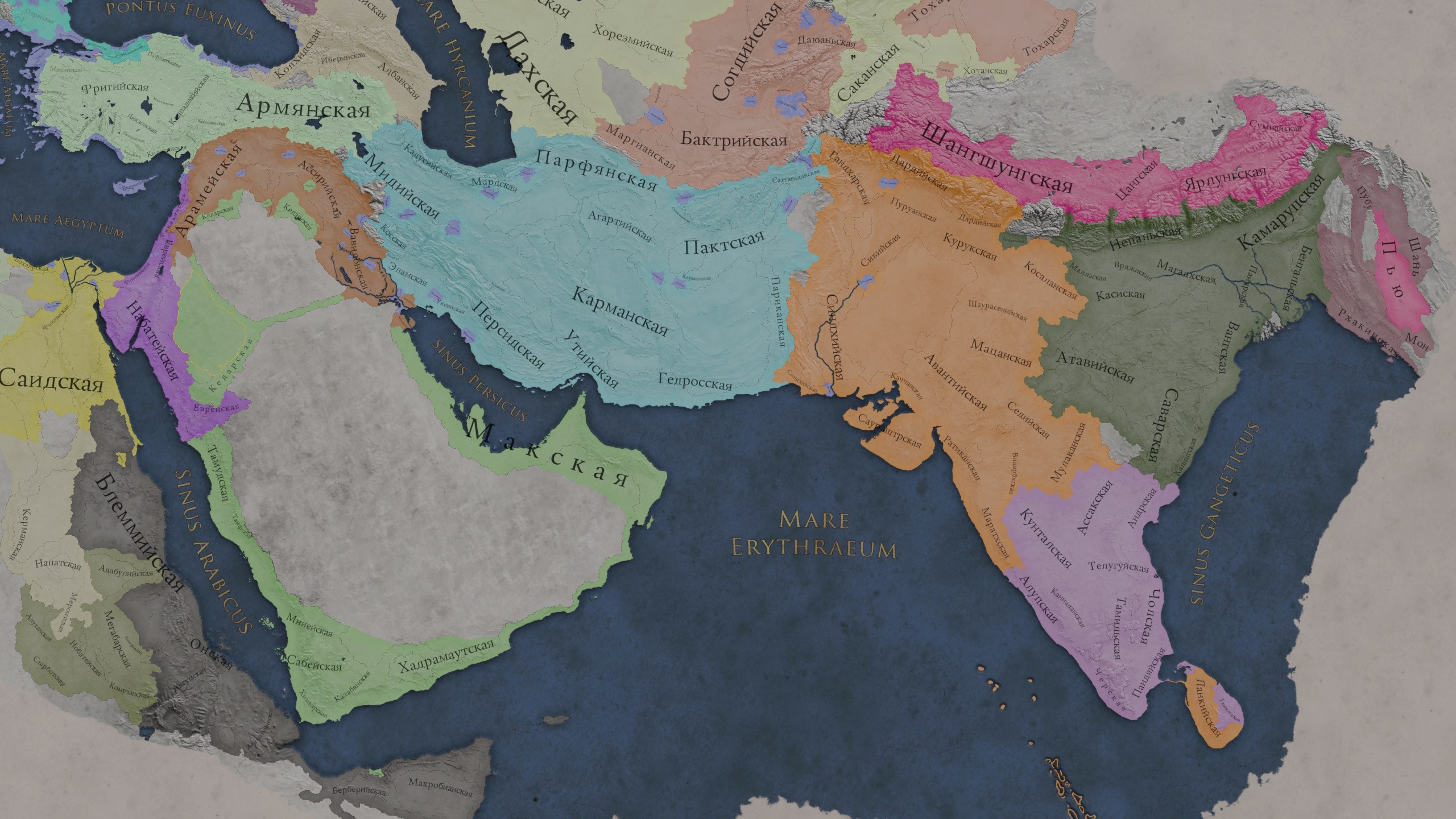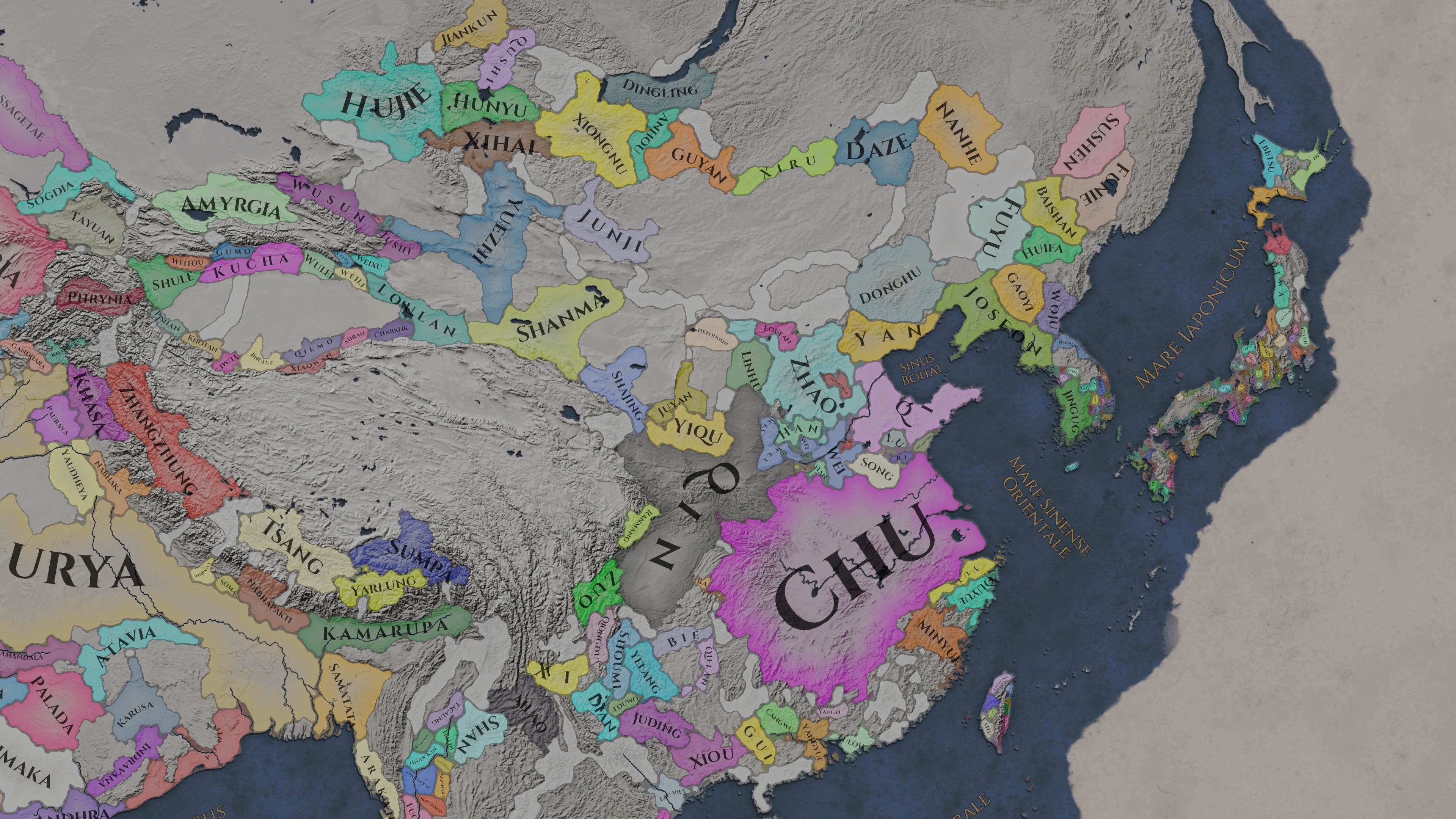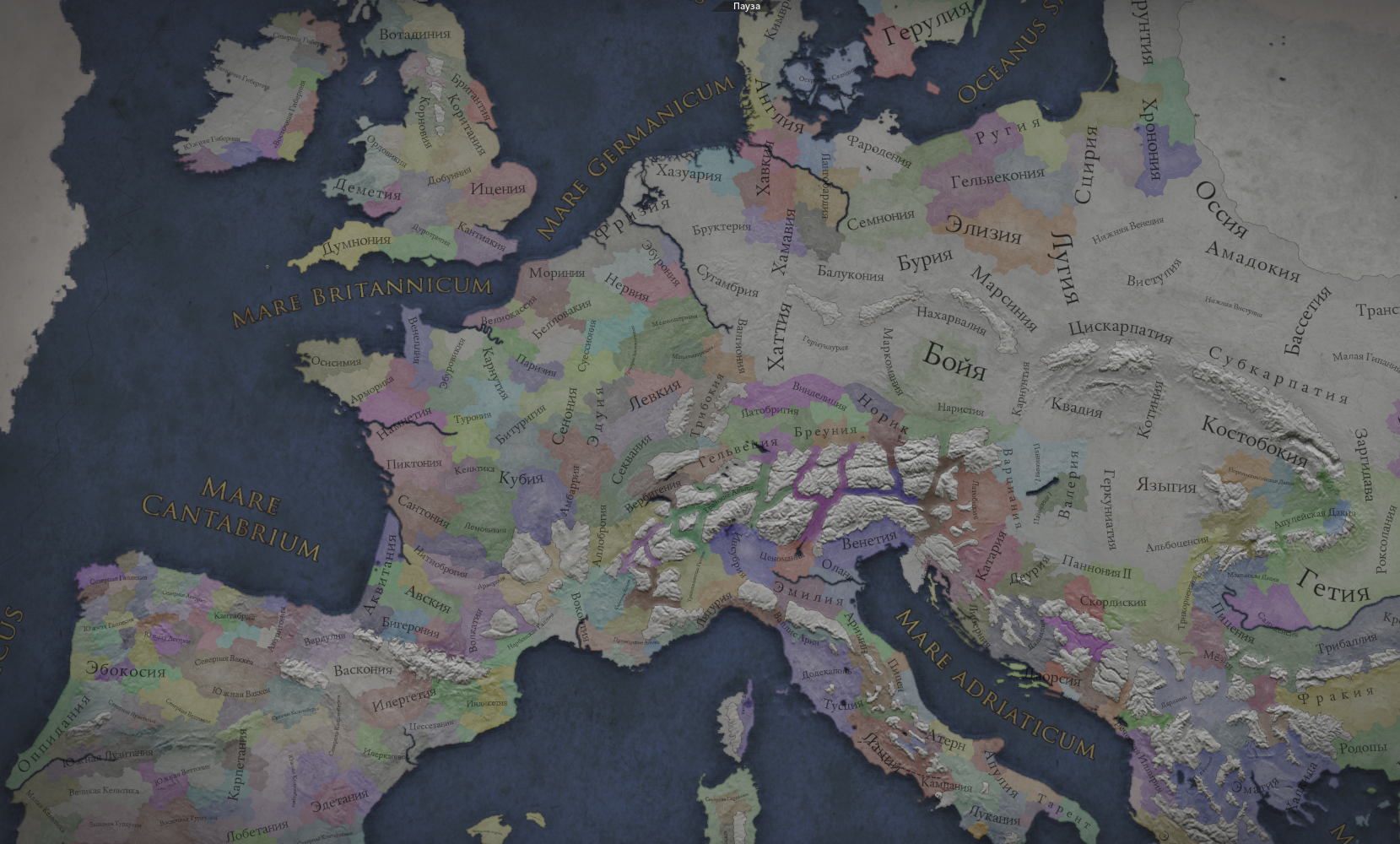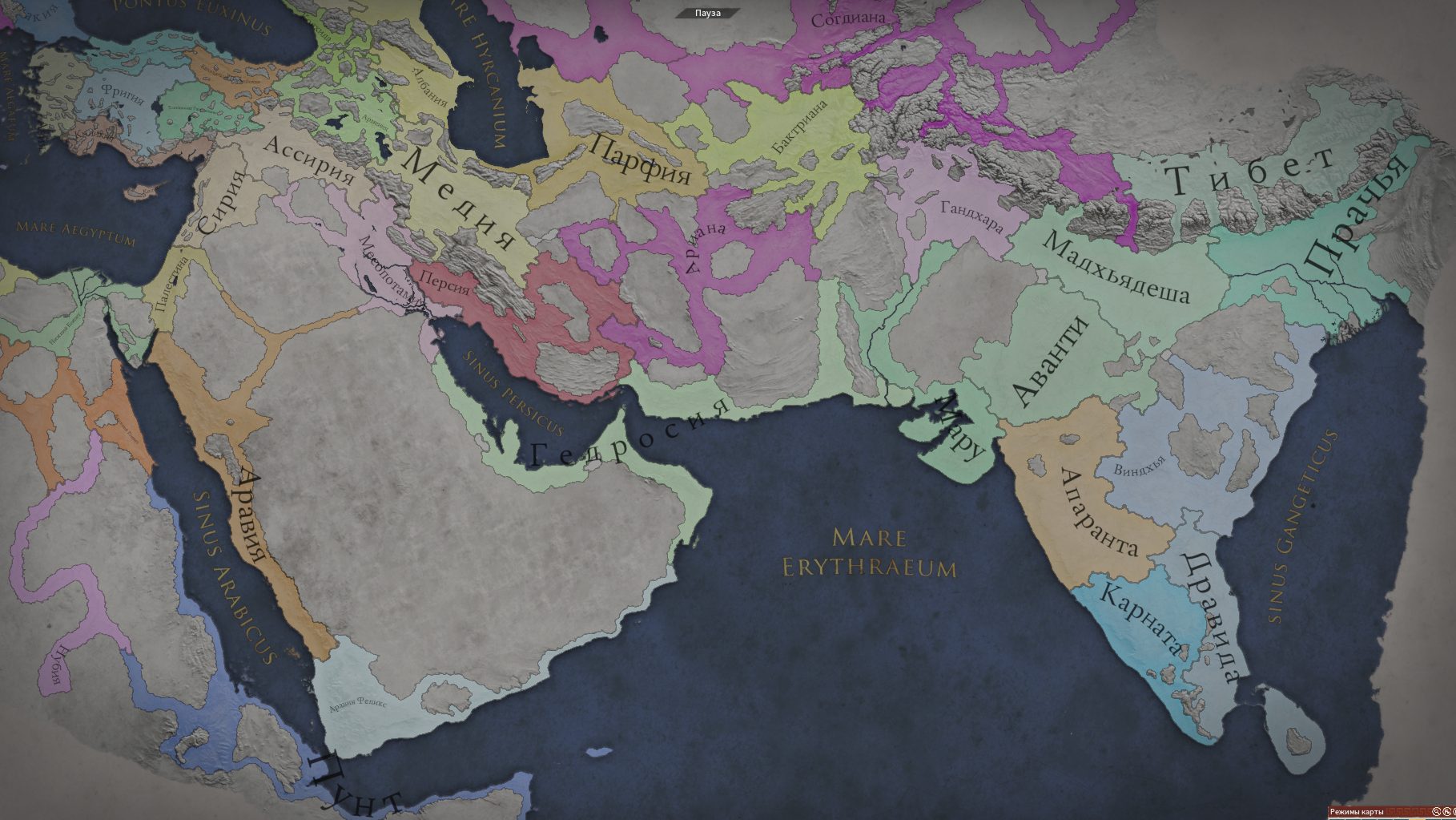 Обратите внимание, что при пролистывании на восток, карта изгибается имитируя глобус, но это чисто визульный эффект, сама карта игро-механически (и на уровне движка), конечно же просто 2D текстура. Стоит ли говорить, что мододелы и тут не удержались, и расширили географию игры аж до Японии