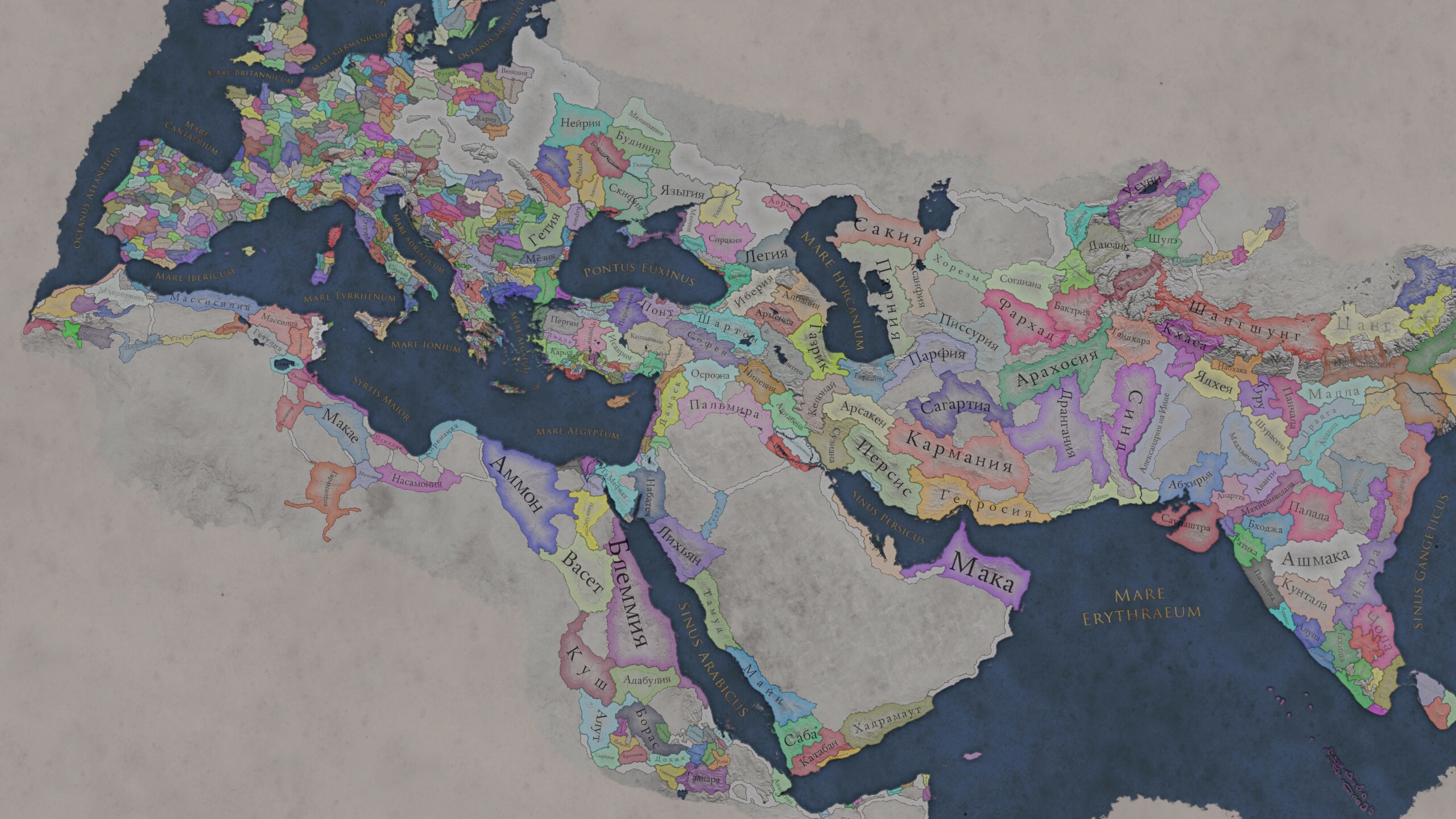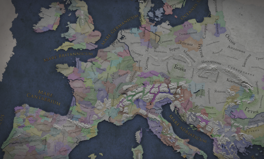Ясно с формой, она прекрасна. Что же до содержания, то по состоянию на 2.0 (а текущая актуальная версия 2.0.4) карта мира включает в себя всю Европу, Британию и Ирландию, Ближний Восток, север Африки, большую часть Средней Азии, Индостан и… и у меня закончился словарный запас. Но в целом вот на этом просторе можно будет развенуться в период с 450 года от основания Города, вплоть до 727, когда игра принудительно подведёт итоги вашего правления.