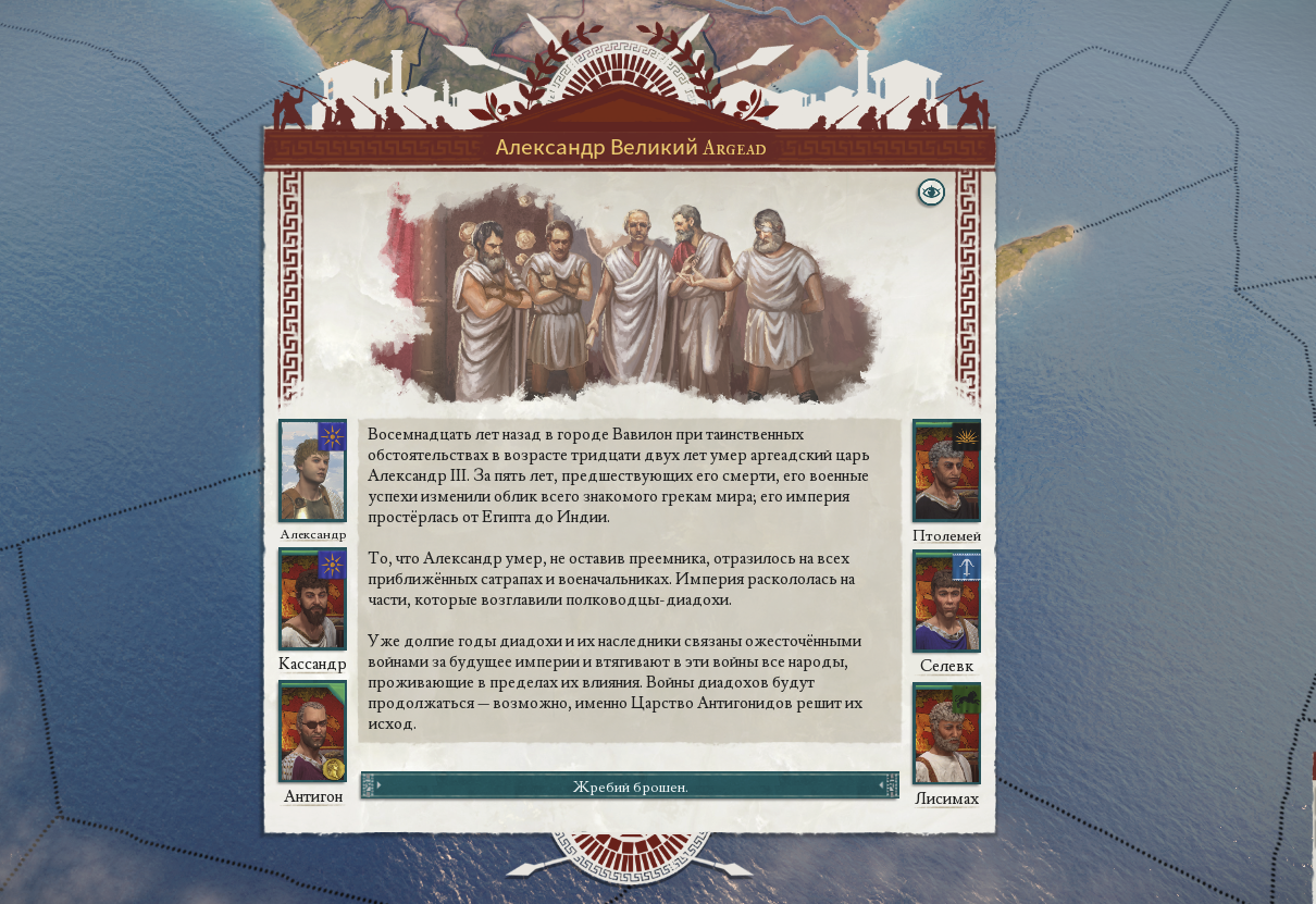 Проблема кроется в войне диадохов, которая является одновременно и началом игры (игра стартует со смерти Александра Великого) и одной из центральных игровых механик. В этой войне участвует более шести стран, поэтому количество контента (уникальные миссии, инновации, артефакты, персонажи, события, механики и даже флаги) добавленного для них естественно перевешивает все «сюжетные» ходы заготовленные для самого Рима. Тем не менее, Вечный город и его обитатели имеют уникальный для других республик в игре Сенат, а это уже много.