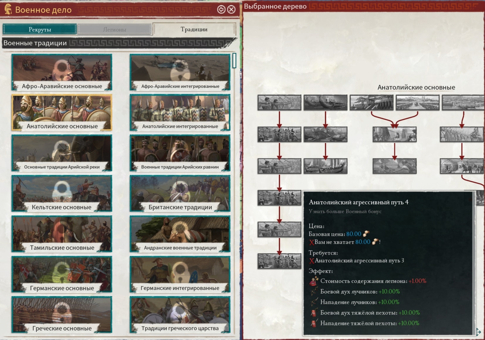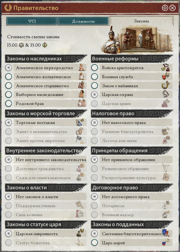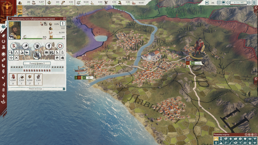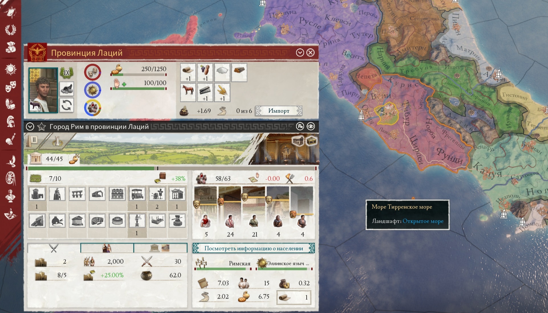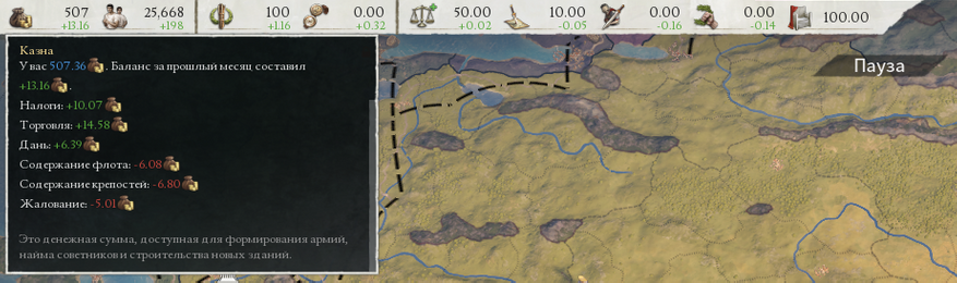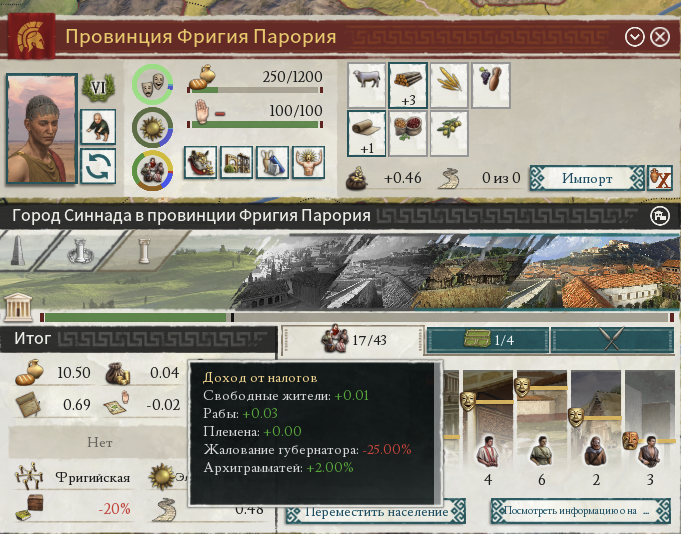 Всплывающая подсказка выше изящно скрывает всего лишь за 6 строками бездну бухгалтерии древнего мира. Налоги платятся отдельными группами населения, пропорционально их счастью и эффективности сбора налогов, с учётом глобальных модификаторов и даже личности царя. Доход от торговли — это вообще консолидированные данные по торговле всех подчинённых провинций, каждая из которых покупает у и продаёт определённое количество товаров другим провинциям (в основном не вашим).