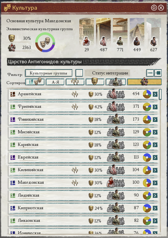 Это мы так плавно перетекли к третьему несомненному плюсу. Страна состоит не только и не столько из территорий, сколько из персонажей и населения. Ополчение подымается не случайно, его количество зависит от мобилизумых групп населения в регионе из которого они подымаются, а их состав зависит от доминирующей культуры.