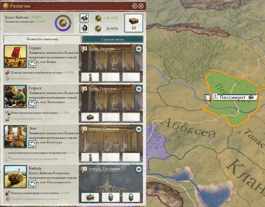 Если этого кому-то покажется мало, то в древности (да что уж древности, посмотрите вокруг) огромное значение в самоопределении общества играла конфессия, то есть религиозная принадлежность. И тут ИР имеет, что сказать. Религии не существуют в вакууме, это группы населения (ласково называемые в контексте игр Параходов «попами» — от POPs, populations) переносят и дают доступ к богам и пророкам определённых верований. У каждого бога глобально на карте может быть только одно святилище, и желательно именно игроку им обладать (а в сетевой игре за них развернётся борьба). В святилища можно класть специальные артефакты, положительно влияющие на территорию, провинцию или на всю страну сразу.