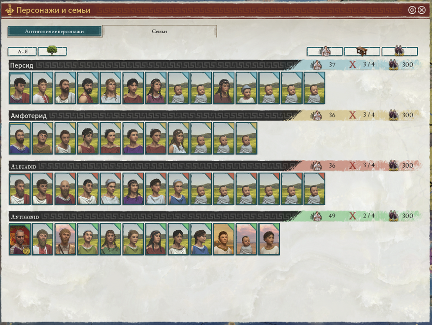 Это на стратегическом уровне управления государством. А на тактическом, страны представлены знатными родами, каждый из которых в свою очередь, состоит из «живых» персонажей.