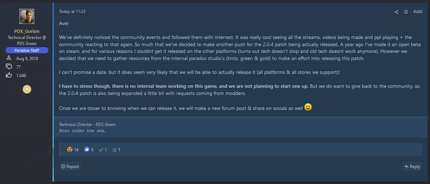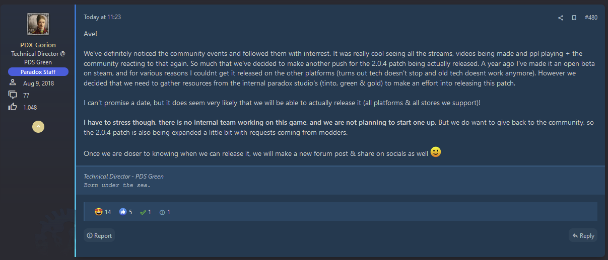 Почему только сейчас? Так получилось, что в момент выхода игры она была типично для Параходов сыра. Лишь спустя два года дополнительной, и почти что бесплатной поддержки со стороны разрабочтика и издателя, можно было смело сказать — эта та игра, в которой хочется быть самому, и куда хочется звать других. А сейчас состоялись оба Дня Императора (на скриншоте выше видно их результат), а также сами разработчики вышли из радиомолчания и впервые за год вернулись к старой теме патча 2.0.4 (который до сих пор ещё в бете).