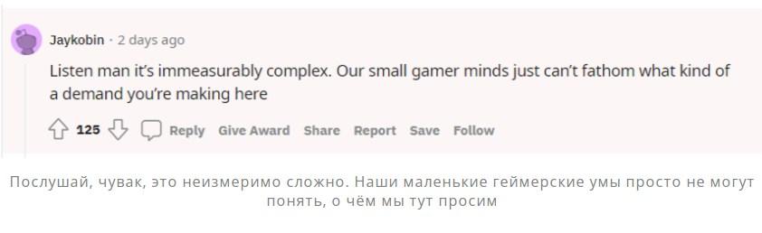 Совершенно очевидно, что игроков такой ответ не устроил, и многие пользователи зацепились за цитату разработчика, в которой присутствует формулировка «immeasurably complex». Эта формулировка сразу же превратилась в популярный мем в сообществе.