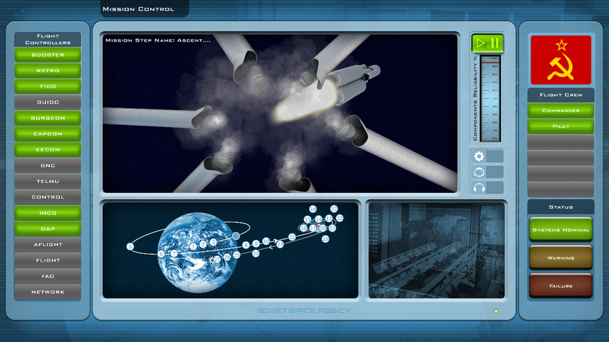 Аналогичное преобразование постигло Центр управления полетами. Количество возможных запусков в сезон зависит не от количества построенных пусковых площадок, а от количества специалистов ЦУП. Инженеры центра отвечают за работу ракет-носителей, технических систем и систем жизнеобеспечения космических кораблей, расчет траектории, администраторскую работу. Руководитель полетами должен разбираться, желательно, во всем. Количество людей, обеспечивающих запуск, зависит от сложности миссии. Так, запуск ИСЗ могут обеспечить всего три человека, для пилотируемого полета на Луну потребуется уже полтора десятка специалистов. И если «прокачка» конструкторов влияет только на скорость разработки, то уровень знаний специалистов ЦУП в игре является ключевым фактором успеха. Дело в том, что в случае технического сбоя при полете, проблемы решает конкретный инженер центра управления и шанс на успешное решение проблемы зависит от уровня его познаний в предмете. Таким образом, прокачанный инженер ЦУП может вытянуть даже плохо разработанную в НИИ «железяку».