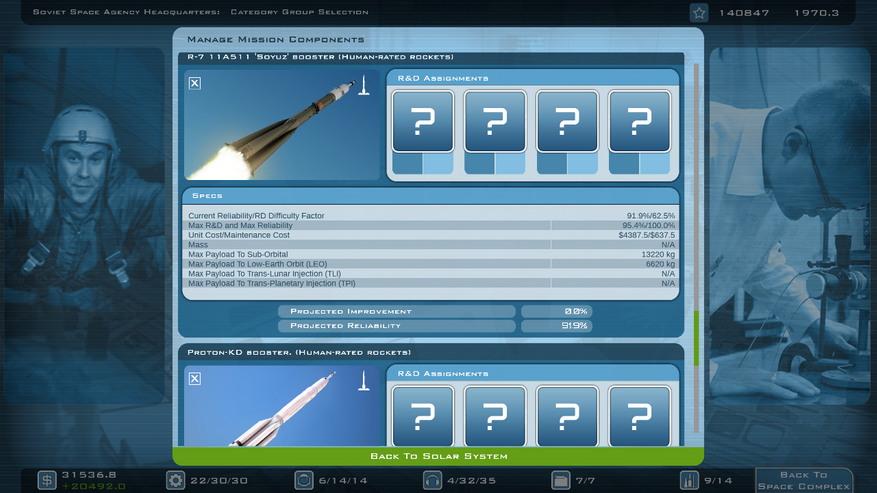 Ключевое же отличие от BARIS — полностью изменены механики исследований и запусков. Игроку необходимо нанимать конструкторов. Инженеры имеют пять возможных специализаций — ракеты-носители, ракеты-носители пилотируемых программ, автоматические станции (спутники), космические корабли, скафандры. Уровень знаний в этих сферах указан в процентах. Чем выше уровень знаний в определенной специальности, тем эффективнее работает сотрудник. На каждую программу можно сформировать отдельное КБ со штатом до четырех инженеров. С сожалению, ВУЗы СССР и США, по мнению разработчиков, не способны выпускать нормально подготовленные кадры, поэтому в космическую программу приходится отбирать специалистов с умениями в 30—50 % от необходимого и дальнейшее обучение проводить непосредственно на своем предприятии, разрываясь между скорейшим завершением разработки и обучением персонала.