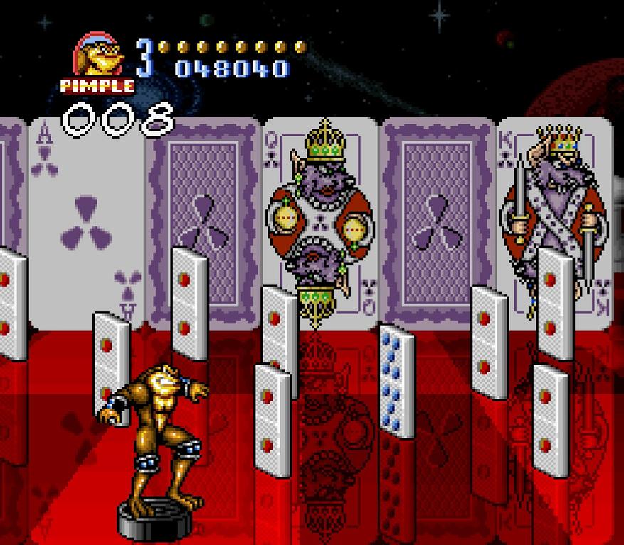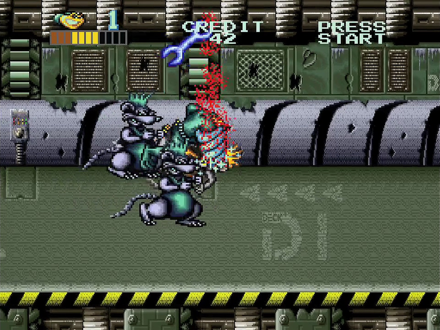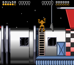 На Beat’em Up же отводится меньше времени, даже если играть идеально. Да и вышел он однообразным. Нет разнообразия врагов, взаимодействие с окружением, интересных боевых приёмов, за парой исключений. После Final Fight или Streets of Rage жанровые особенности в творении Rare кажутся примитивными. Beat’em Up сам по себе несложный жанр в плане механик, но жабы даже на этом фоне выглядят слабо. Вытаскивает лишь удар с разгона, когда персонаж врезается во врага, а у героя вырастают рога на голове при столкновении.