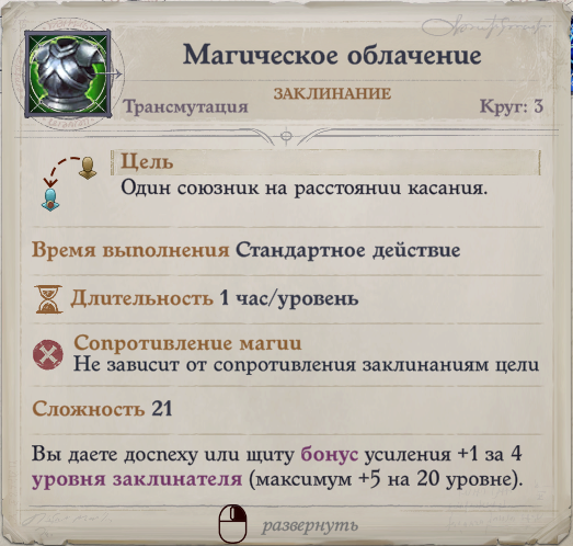 - Магическое облачение - добавляет бонус брони к доспеху или одежде персонажа (на одежду и броню разные слоты).