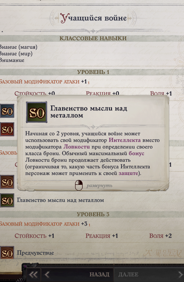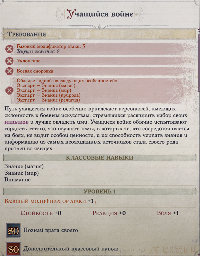 Учащийся войне имеет ряд требований. Базовый модификатор атаки - 5, черты - эксперт в любом виде навыка знания, боевая сноровка, уклонение. Модификатор атаки успеет перешагнуть нужный порог к седьмому уровню, на первые две черты придется потратить очки уровня, а вот с уклонением могут возникнуть трудности. У этой черты имеется необходимый порог ловкости, которую вы уже заминусили на старте. Решается с выбором одного уровня монаха, позволяющего изучить ее без ограничений. Уже на восьмом уровне вы сможете взять престиж-класс, а на девятом получить заветный бонус к броне от интеллекта.
