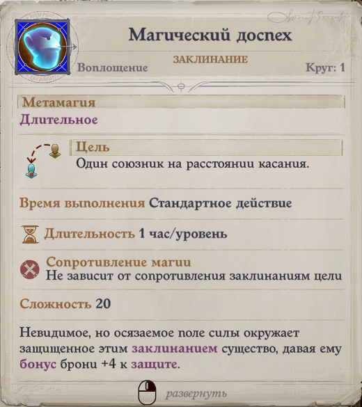 Чтобы дополнительно повысить броню вашего персонажа полезно сочетать следующие заклинания мага: