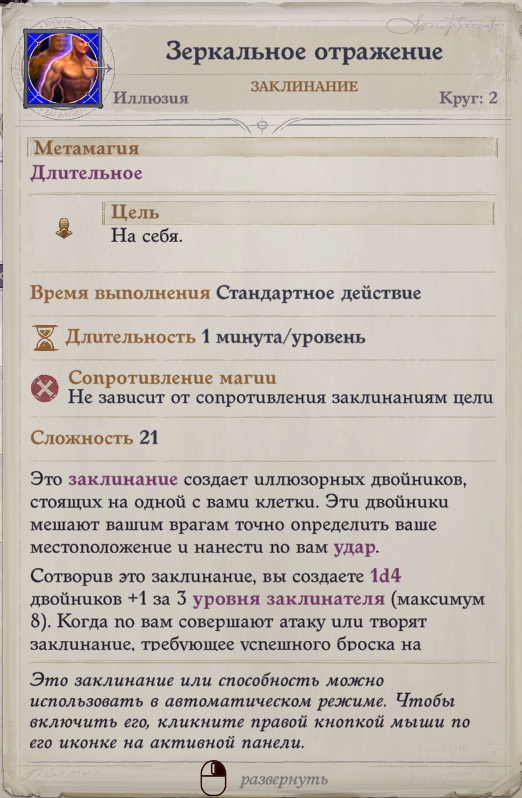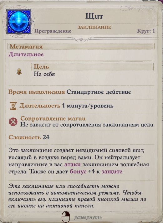 - Щит - дает бонус к классу защиты и иммунитет к магическому снаряду.