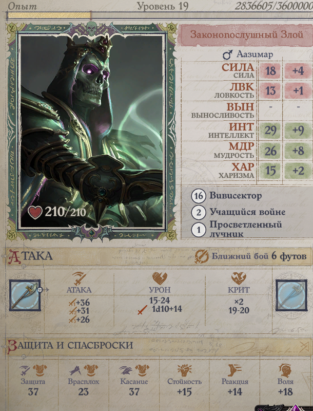 В распределении стартовых характеристик самое главное помнить, что максимальное число бонусных уровневых очков на них будет нечетным. Мой вариант - 18 интеллекта, 18 мудрости или харизмы, 11 силы; минус - все остальное. Сила нужна будет для базового модификатора атаки (требование к престиж классу), харизма/мудрость - для бонуса к классу брони. Мудрость - очень полезная характеристика, дающая спасбросок на силу воли и бонус некоторым навыкам, делающим персонажа более самостоятельным, а следовательно гибким в выборе компаньонов. Но имейте в виду, если планируете отыграть лича: у нежити отсутствует характеристика конституции, а вместо нее задействована харизма. В нежить вы превратитесь только в пятой главе, но все же.
