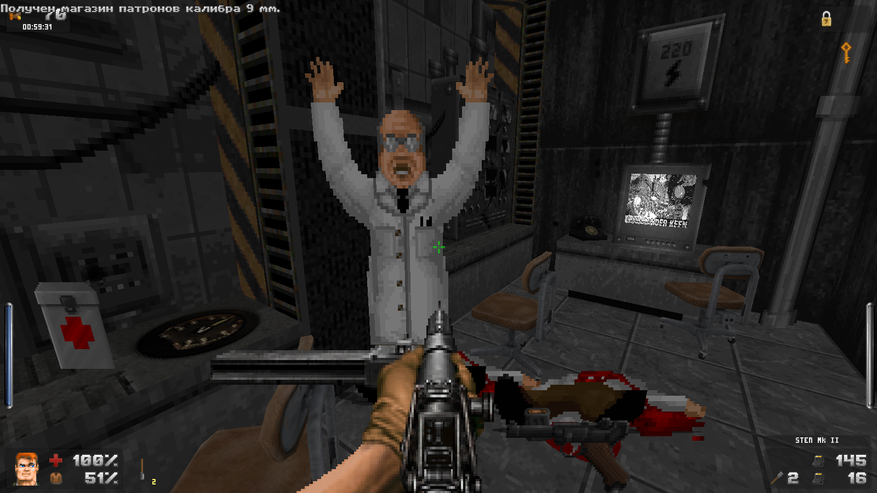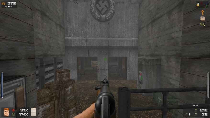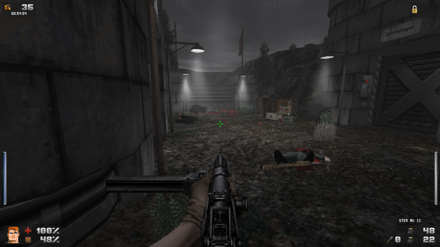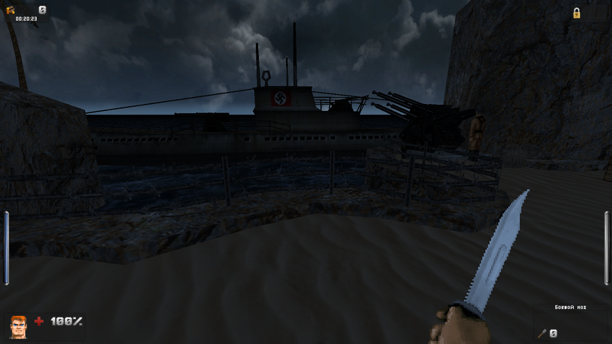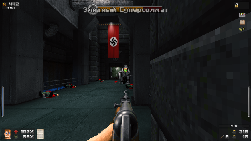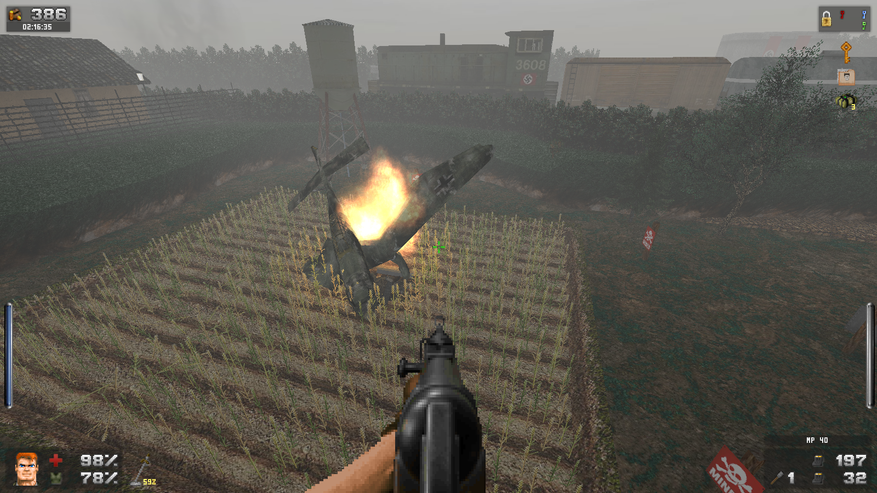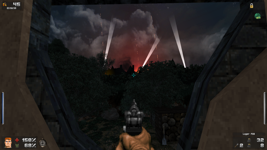 Зато дизайн локаций просто великолепен. Даже и не верится, что это чутка доработанный GZDoom. В своих путешествиях Бласковиц посетит и северную Африку, и оккупированную Европу, и южную Америку, а закончится все в том самом замке — последнем оплоте сил зла. И каждая локация наполнена таким количество неповторяющихся деталей, что любой ААА проект с их копи-пастой тихо стоит и курит в сторонке. На первом же уровне, убрав часового с помощью саперной лопатки, вы можете постоять чуть-чуть и полюбоваться на проплывающую в море нацистскую подводную лодку. А как тут замечательно показаны густые леса! Различные бункеры и лаборатории врага выглядят так, как бы они выглядели в реальности. А от миссии на борту дирижабля я вообще в восторге. А как тут показаны бои в полуразрушенном городе: зенитный огонь на горизонте, пролетающие в небе десантные самолеты, выстрелы и падающие бомбы. Атмосфера ужасной войны передается даже лучше, чем в Medal of Honor или Call of Duty. И это на старом движке с пиксельной графикой! Вот что значит вкладывать душу в свой проект.