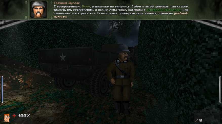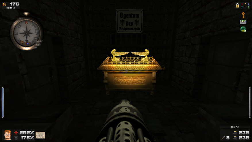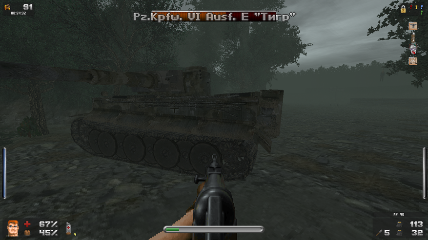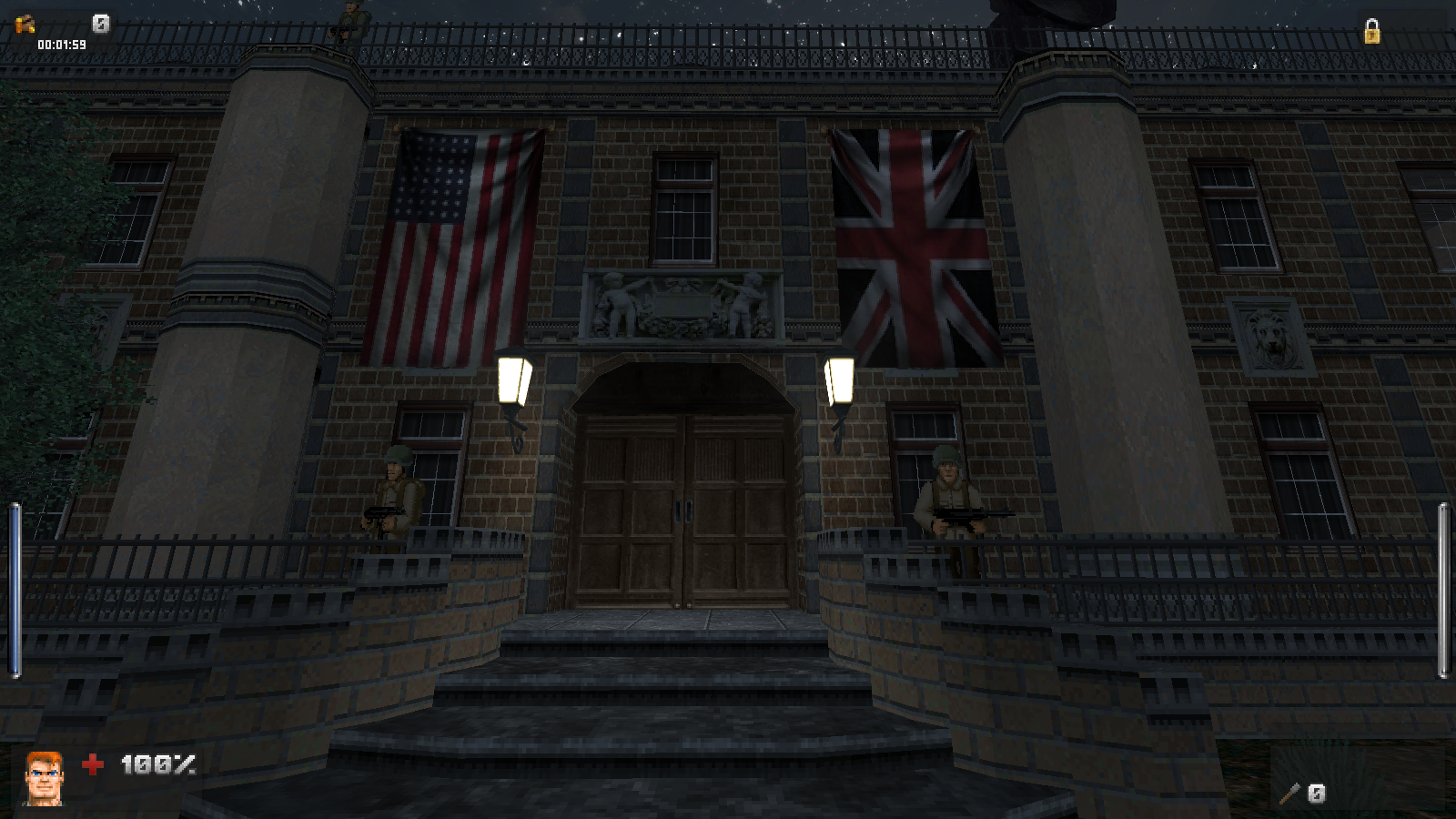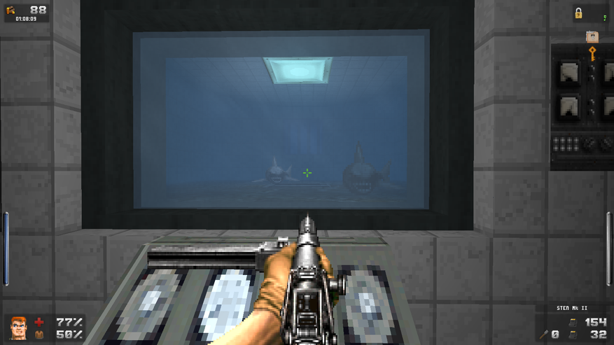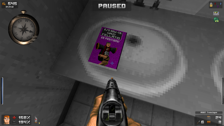Зато дизайн локаций просто великолепен. Даже и не верится, что это чутка доработанный GZDoom. В своих путешествиях Бласковиц посетит и северную Африку, и оккупированную Европу, и южную Америку, а закончится все в том самом замке — последнем оплоте сил зла. И каждая локация наполнена таким количество неповторяющихся деталей, что любой ААА проект с их копи-пастой тихо стоит и курит в сторонке. На первом же уровне, убрав часового с помощью саперной лопатки, вы можете постоять чуть-чуть и полюбоваться на проплывающую в море нацистскую подводную лодку. А как тут замечательно показаны густые леса! Различные бункеры и лаборатории врага выглядят так, как бы они выглядели в реальности. А от миссии на борту дирижабля я вообще в восторге. А как тут показаны бои в полуразрушенном городе: зенитный огонь на горизонте, пролетающие в небе десантные самолеты, выстрелы и падающие бомбы. Атмосфера ужасной войны передается даже лучше, чем в Medal of Honor или Call of Duty. И это на старом движке с пиксельной графикой! Вот что значит вкладывать душу в свой проект.