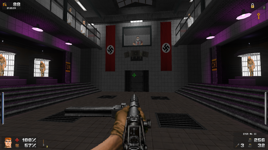 Игра из-за карикатурной спрайтовой графики не выглядит какой-то совсем уж серьезной. Хотя в ней и поднимаются темы войны, уничтожения людей в промышленных масштабах, ужасы расизма и нацизма. Скорее даже наоборот — игра из-за графики выглядит сюрреалистичной. В игре есть боссы, которые действительно жирные — в разы шире и выше обычных людей. Отъелись на казенных харчах. А уж сам фюрер вместо хрупкого чахоточного дрыща в игре представлен накаченным уберменшем, как будто бы с плаката про истинного арийца. Видимо это дань оригиналу, где противники действительно выглядели карикатурно и нелепо. В этих их синих сапожках (я в курсе, что это из-за ограничения вывода графики тех лет). Такой графический стиль я не считаю чем-то плохим. Главное в игре — геймплей и сюжет, а визуальная составляющая — дело десятое.