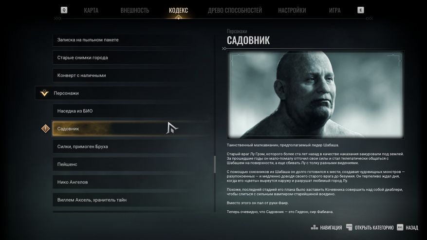 Но не стоит удивляться: все малкавиане в той или иной степени безумны. Там, где одни говорят стихами и страдают от тяжёлых психических расстройств — привет сёстрам Воерман из первой части Vampire: The Masquerade — Bloodlines, другие относительно вменяемы и адекватны. Увы, но о способностях детектива даже рассказать толком нечего: стирание воспоминаний, допрос, перемотка, которая немного ускоряет передвижение по городу, и маска тысячи лиц.