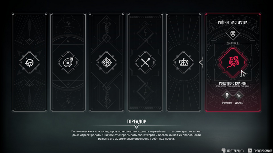 Тут же игрок прокачивает дисциплины всех доступных кланов. Обучение клановой дисциплине представителя не клана является как жестом доверия, так и клеймом в форме мишени на том, кто этой дисциплине обучит. Ведь по сути это помощь тому, кто в будущем, вероятно, пополнит ряды врагов. И ладно, если бы речь шла о дисциплинах, которыми владеют большинство кланов, таких как могущество или стремительность.