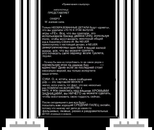 Напоследок SKIDROW отметили, что отрицают слова EMPRESS в свой адрес касательно взлома Fe и готовы на деле доказать своё умение. Они полностью удалят Denuvo из игры, а EMPRESS, как проигравшая, должна будет выложить видео, где «она» без одежды из без «уродливого» лица.