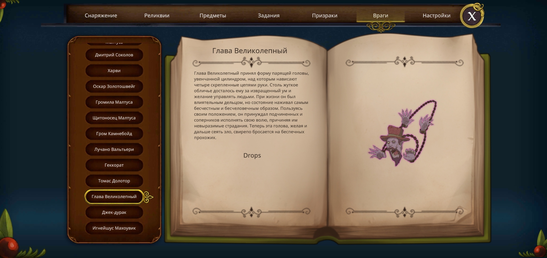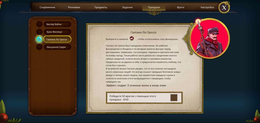 Реликвии, коих всего тридцать, можно получить двумя способами — какие — то купить у торговца, а немалое число отыскать на локациях. Применить активное свойство можно только у четырёх реликвий одновременно. Польза реликвий разнится. Например, мешок Ганнибала притягивает оставленное врагами золото поблизости, что скорее приятный бонус, чем существенная помощь. Черный пояс Эми увеличивает скорость бега протагониста, о чём я игру вообще не просил. Ни в боях, ни при перемещении по локациям, скорость бега не является подспорьем. А вот Перчатка Арин, которая даёт 10-% процентный шанс получить «аптечку» из врага, стала для меня незаменимым, верным спутником. Есть реликвии, которые увеличивают урон оружия главного героя, призраков, постепенно восстанавливают здоровье, что критически важно для победы нескиловым геймеерам, типа меня.