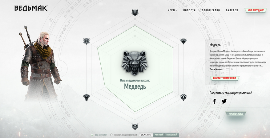 Тест можно пройти на thewitcher.com. После завершения опроса, вы сможете узнать больше об определённой школе ведьмаков, а также скачать стилизованные обои, рамки для аватара и веб камеры.
